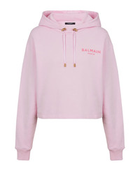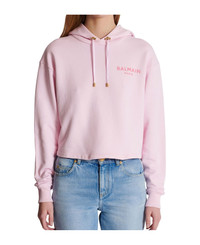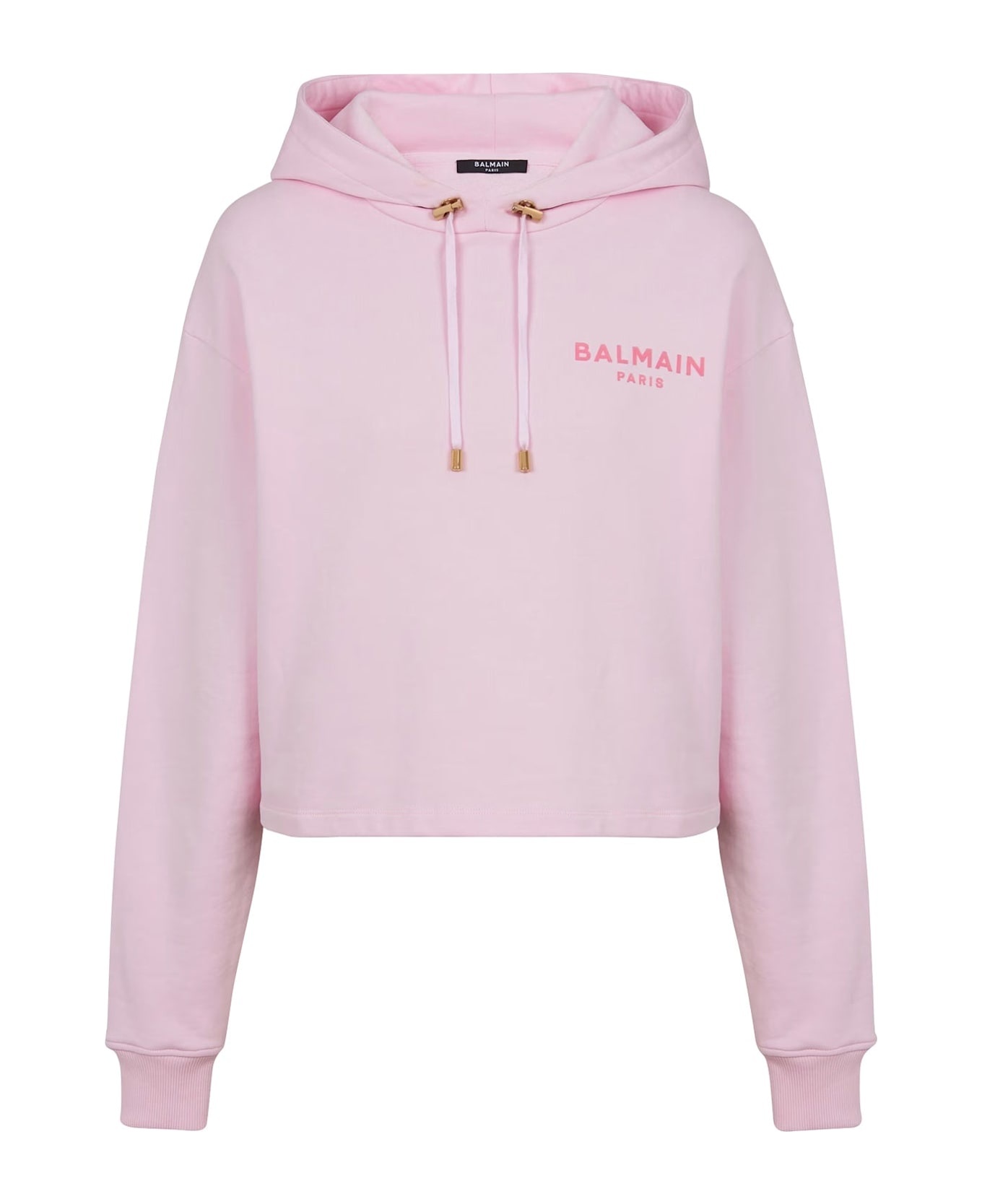 100% Cotton Long sleeves Ribbed trims Cropped fit Machine wash (delicate) Contrasting flocked Balmain Paris logo on the front Drawstringadjustable hood Gold metal aglets, stoppers and eyelets Made in Portugal Made in: European Union Color: Pink Model number: DF1JP040BB01OIS