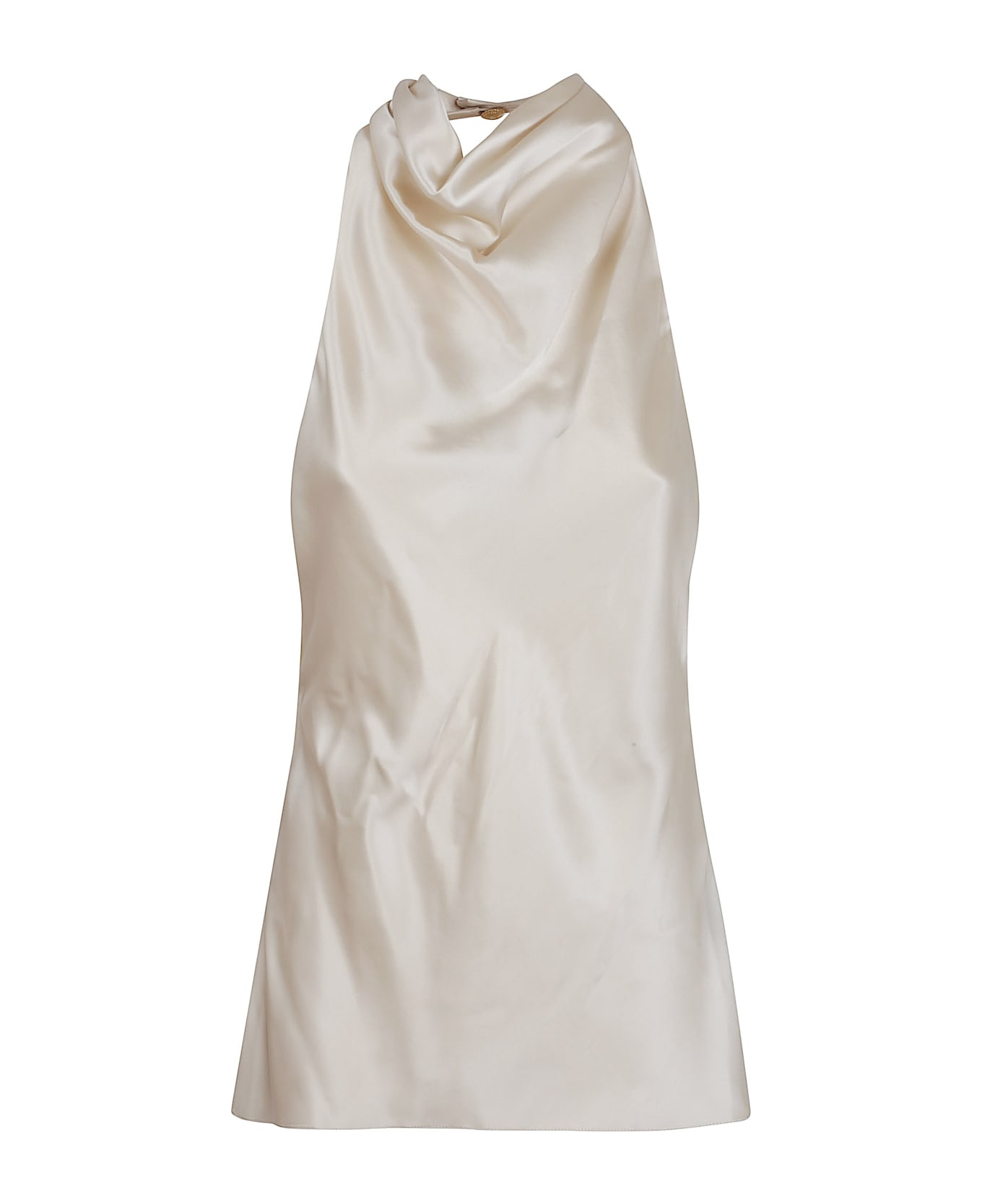 Crepon-effect satin top by BALMAIN. High neck with a draped effect; hook-and-eye closure; fluid, fitted design. Made in: Portugal Color: As Beige Size and fit: - Regular fit, recommend you get your regular size Model number: FF1AE165SE950AS