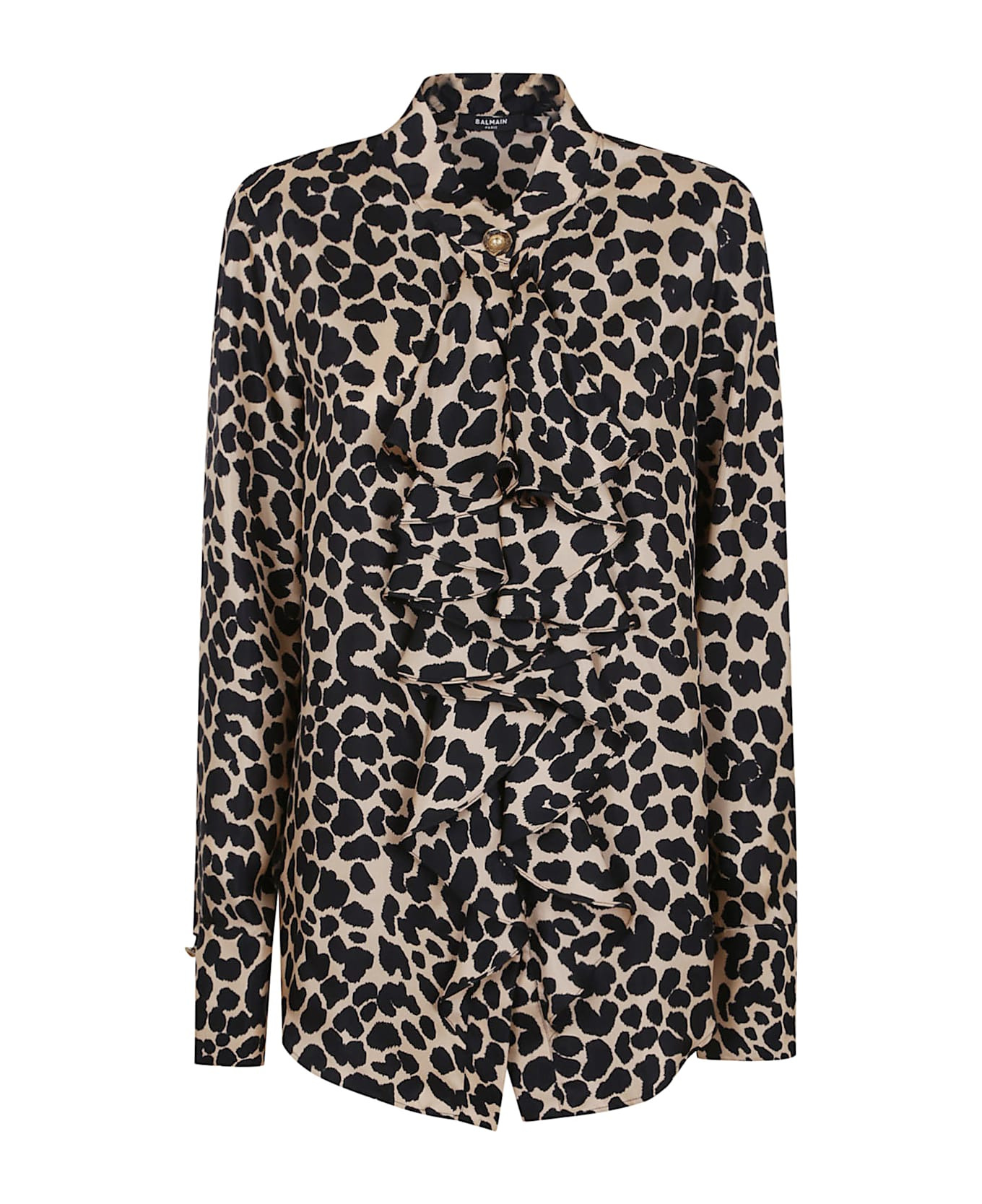 Leopard-print serge shirt by BALMAIN. Classic collar; seven-button front closure; long sleeves; straight three-button cuffs; rounded hem and a straight, flowing fit. Featuring metal "Gold and Gold Coin" buttons and a jabot-style ruffle-trimmed closure. Made in: Italy Color: Gba Beige Noir Size and fit: - Regular fit, recommend you get your regular size Model number: FF1HR150SF10GBA
