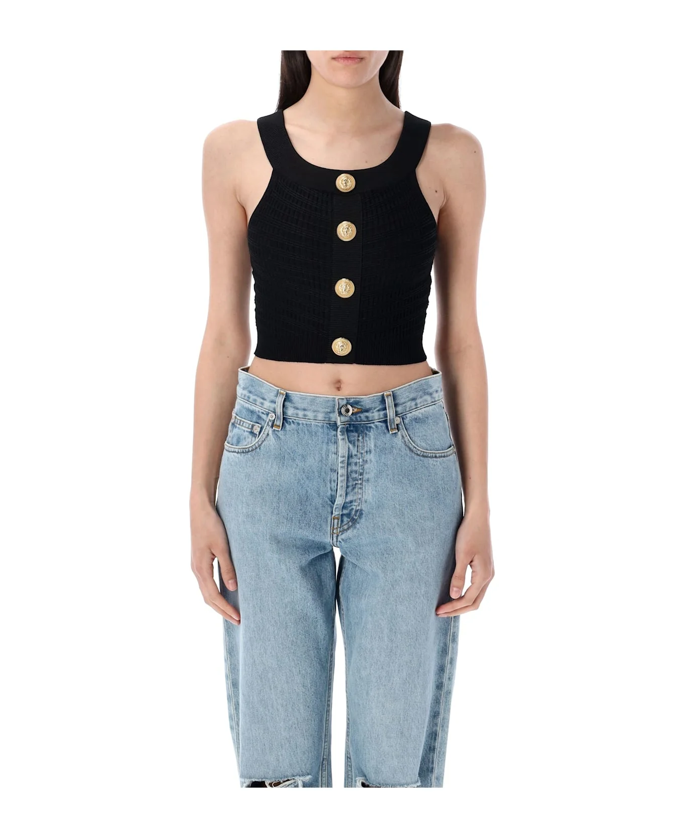 Knit Top With Gold Buttons By Balmain. Featuring: Scoop Neck Sleeveless Gold Embossed Buttons On Front Rib Trims Cropped Model Is 1,70 M And Wears Size 36 Composition: 84% viscose, 16% polyester Made in: Italy Color: BLACK Model number: EF0AB426KI420PA