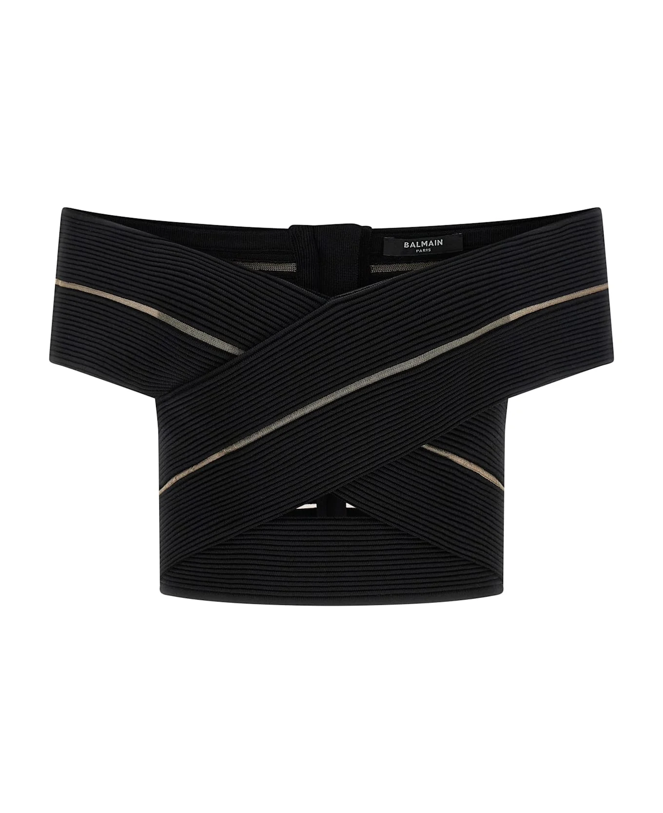 Stretch viscose top with transparent mesh inserts, off-the-shoulder crop model, upper and lower front V-neck with X-insert, back zip closure. Composition: 77% viscose 14% polyester 8% polyamide 1% elastane Made in: Italy Color: Black Size and fit: - true to size fit - FRENCH size Model number: GF0AB580KJ750PA