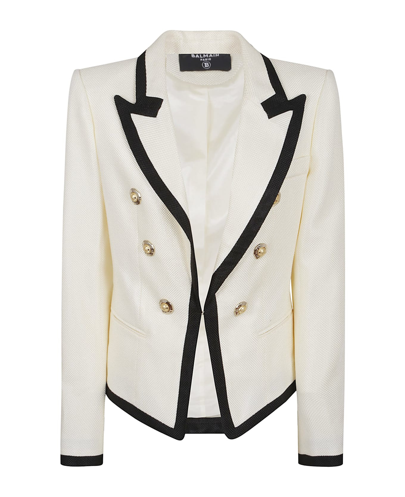 Natte jacket with serge lining by BALMAIN. Italian tailored collar; structured shoulders; long sleeves; one chest pocket, two side slash pockets, and one interior cut-out pocket; invisible hook closure; slim fit and cinched waist. Featuring straight cuffs with five gold-tone metal "Coin" buttons, also featuring decorative buttons on the front, and contrasting trim. Made in: France Color: Gwo Ecru Noir Size and fit: - Regular fit, recommend you get your regular size Model number: FF1SE165VI29GWO