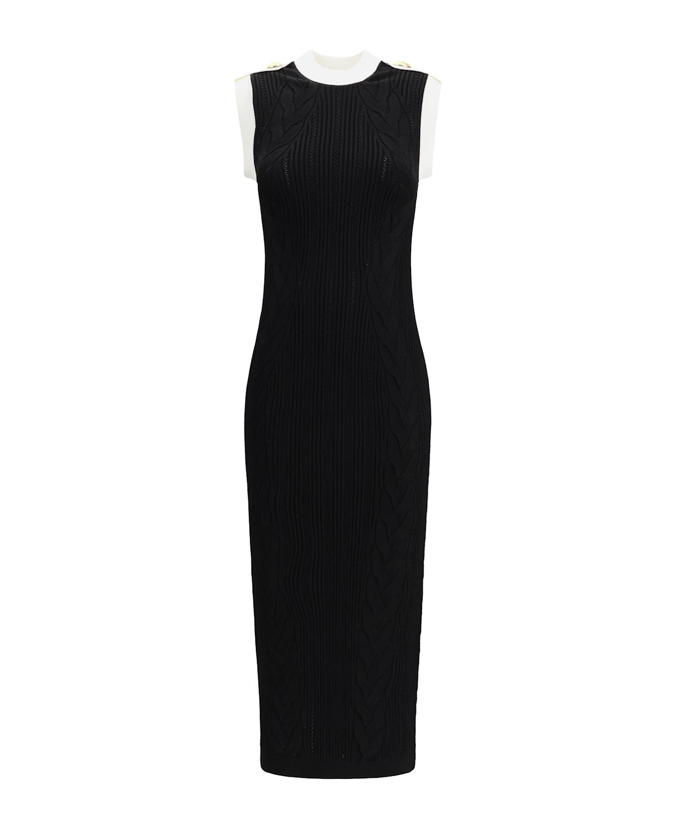 Balmain's long dress is a bold and refined garment made of a twisted knit with openwork that enhances the silhouette. the round neckline is framed by a contrasting ribbed finish, also echoed on the armholes. the contrasting straps are embellished with the distinctive gold metal "lion chain" buttons, the distinctive symbol of the maison. sleeveless and with a long, fitted fit, this dress combines structured elegance and contemporary sensuality. Composition: 84% % Viscose, 16% % Polyester Made in: Italy Model number: FF1RJ032KI64EAB