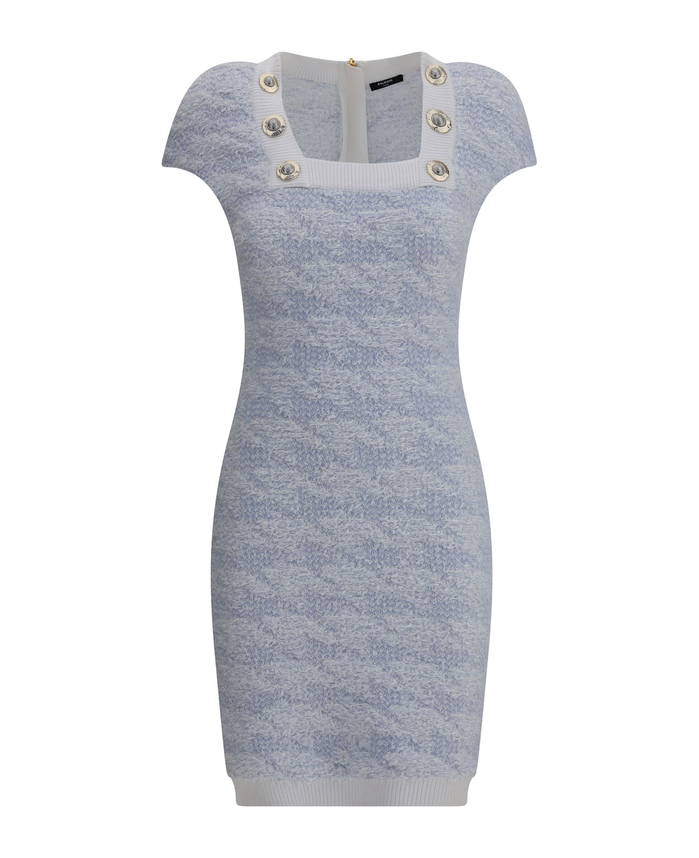 Balmain's stretch midi dress combines style and comfort with a fitted, modern silhouette. it features a ribbed square neckline embellished with embossed button details, short sleeves, and a back zipper closure for an elegant and refined look perfect for any occasion. Composition: 66% % Polyamide, 16% % Viscose, 13% % Cotton, 5% % Polyester Made in: France Model number: FF1R6136KI72SOM