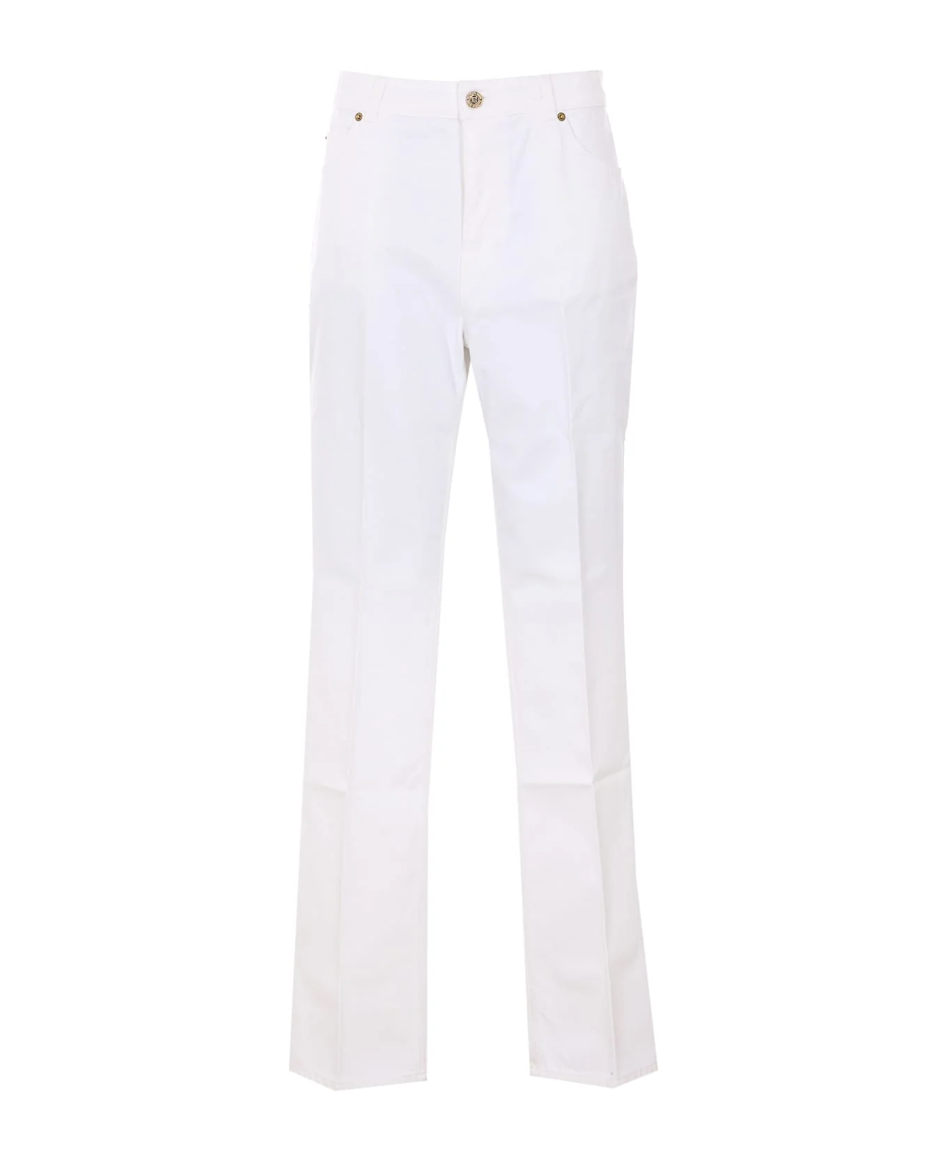 Balmain white tailored jeans, button and zip closure, patch logo on the back, 5 pockets, regular fit Composition: 100% Cotton, 65% Polyester, 35% Cotton Made in: Italy Color: White Size and fit: - EU SIZE (IT) Model number: MI070DG140FC