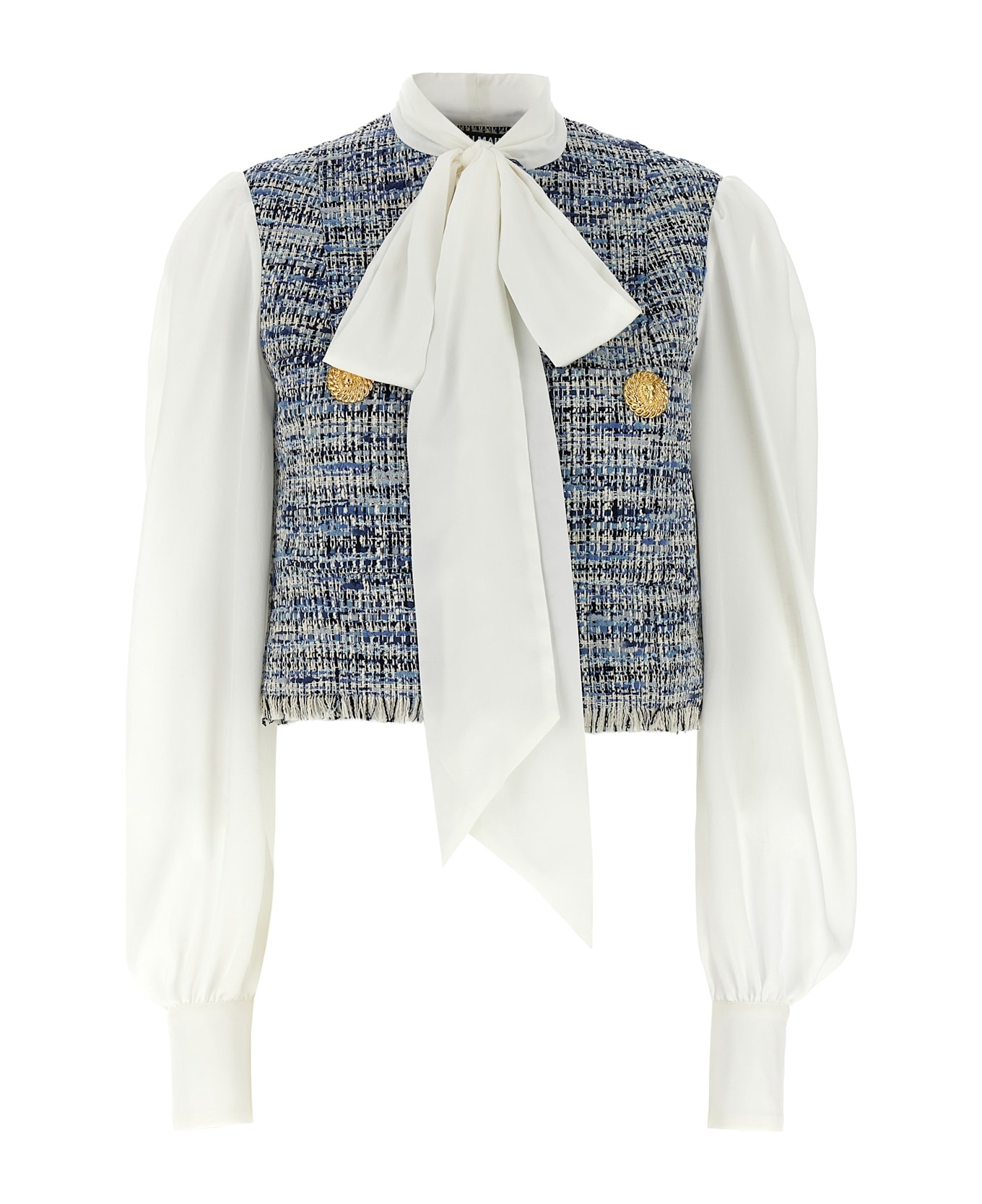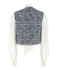Crepe de chine shirt with tweed vest, levalliere sleeves and collar, cropped style with fringes on the hem, 'Chiocciola' button closure, pockets, long cuffed sleeves. Composition: 78% cotton 10% acetate 8% vi 3% polyamide 1% polyester Made in: France Color: Multicolor Size and fit: - true to size fit French size Model number: EF1SD211MG25SOF
