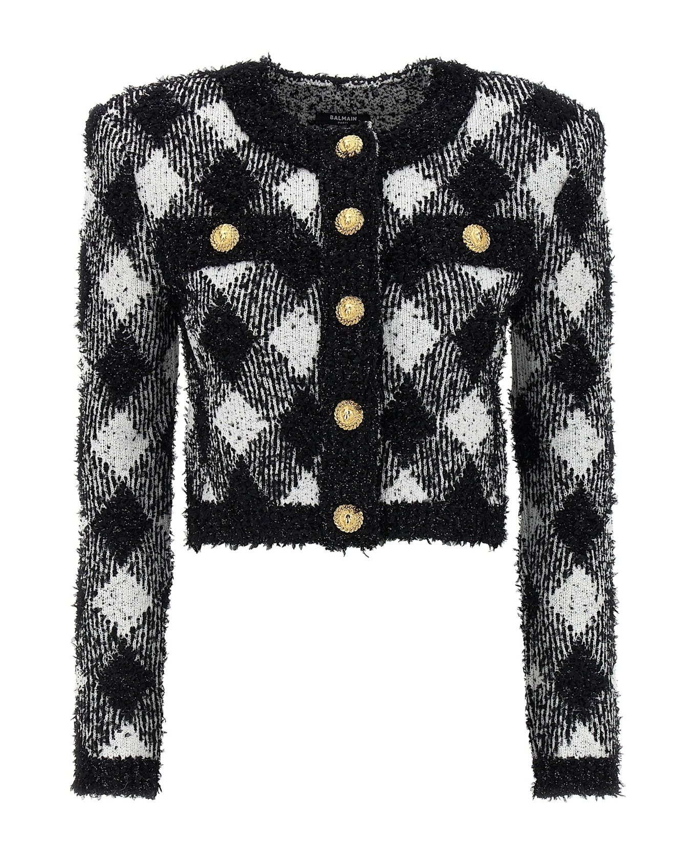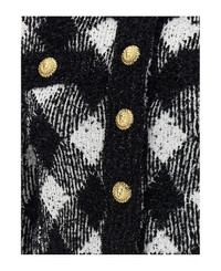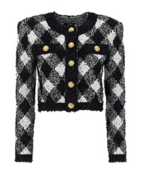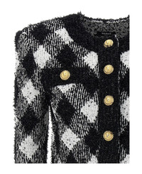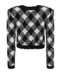 Short jacket in lurex tweed with macro vichy print, crew neck, padded shoulders, long sleeves, gold metal closure and button applique. Composition: 47% polyamide 42% vi 8% polyester 3% mf Color: White/Black Size and fit: - true to size fit French size Model number: DF0SK248KH66EAB