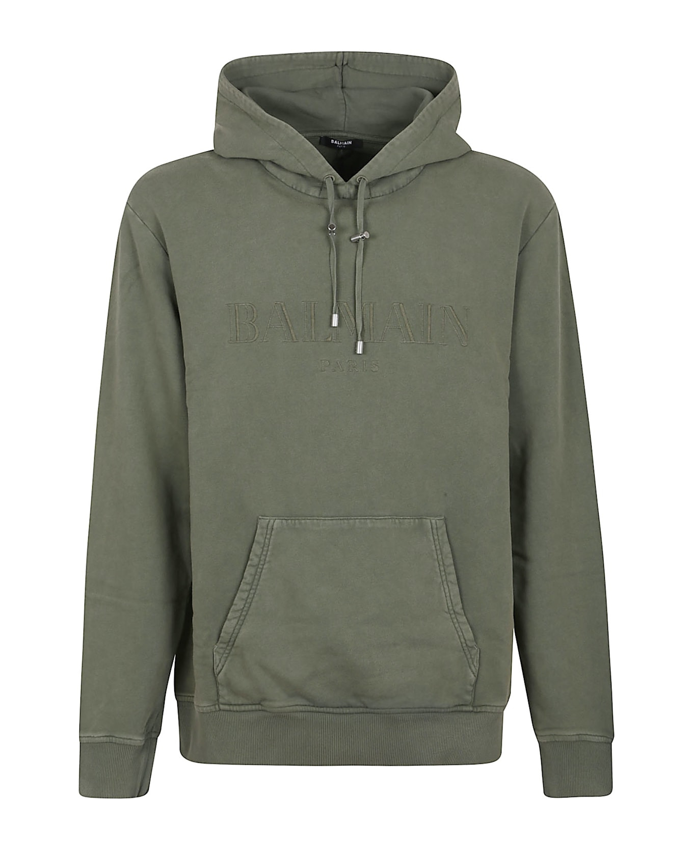 Pure cotton sweatshirt by BALMAIN. Adjustable drawstring hood with silver-tone metal toggle and hems; long sleeves; cuff pocket; regular fit; contrasting ribbed trim. Featuring a tone-on-tone embroidered Balmain Vintage logo on the front and a pigment-dyed finish, a unique creation. Made in: Portugal Color: Uia Kaki Kaki Size and fit: - Regular fit, recommend you get your regular size Model number: FH1JT047BC72UIA
