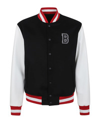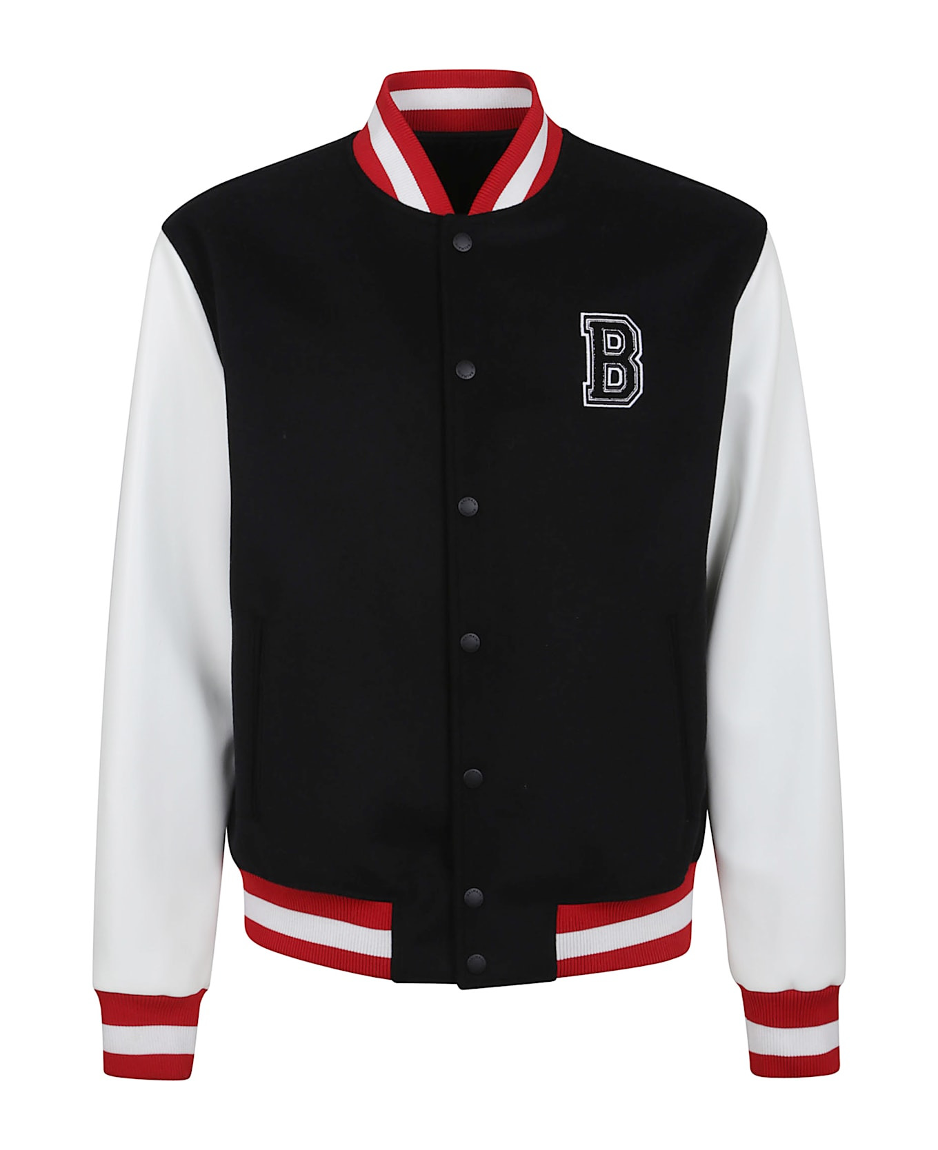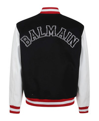 Wool and faux leather varsity jacket with satin lining by BALMAIN. Front closure with seven Balmain-engraved snap buttons; two side slash pockets and one interior snap pocket; contrasting ribbed trim with stripes; regular fit. Featuring long contrasting faux leather sleeves, an embroidered bouclette varsity patch on the chest, and embroidered Balmain bouclette patches on the back. Made in: Moldova Color: Ebe Noir Blanc Rouge Size and fit: - Regular fit, recommend you get your regular size Model number: FH1TFA80ME53EBE