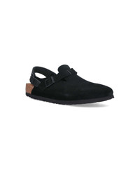 Birkenstock 'Tokio' black suede mules with round toe, adjustable top straps, engraved logo buckle detail, anatomical cork and latex footbed, slip-on fit, black rubber sole. Composition: 100% Leather Made in: Germany Color: Black Model number: 1028348BLACK
