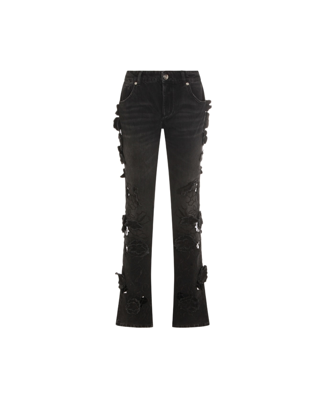 Black cotton jeans from Blumarine featuring belt loops, zip and button fastening, cut out, floral embellishments and regolar vestibility. Composition: _tessuto: 100% Co; Int. Tasche: 65% Pl, 35% Co; Ricamo: 100% Cotton Made in: Albania Color: Black Model number: A544J113AN0990