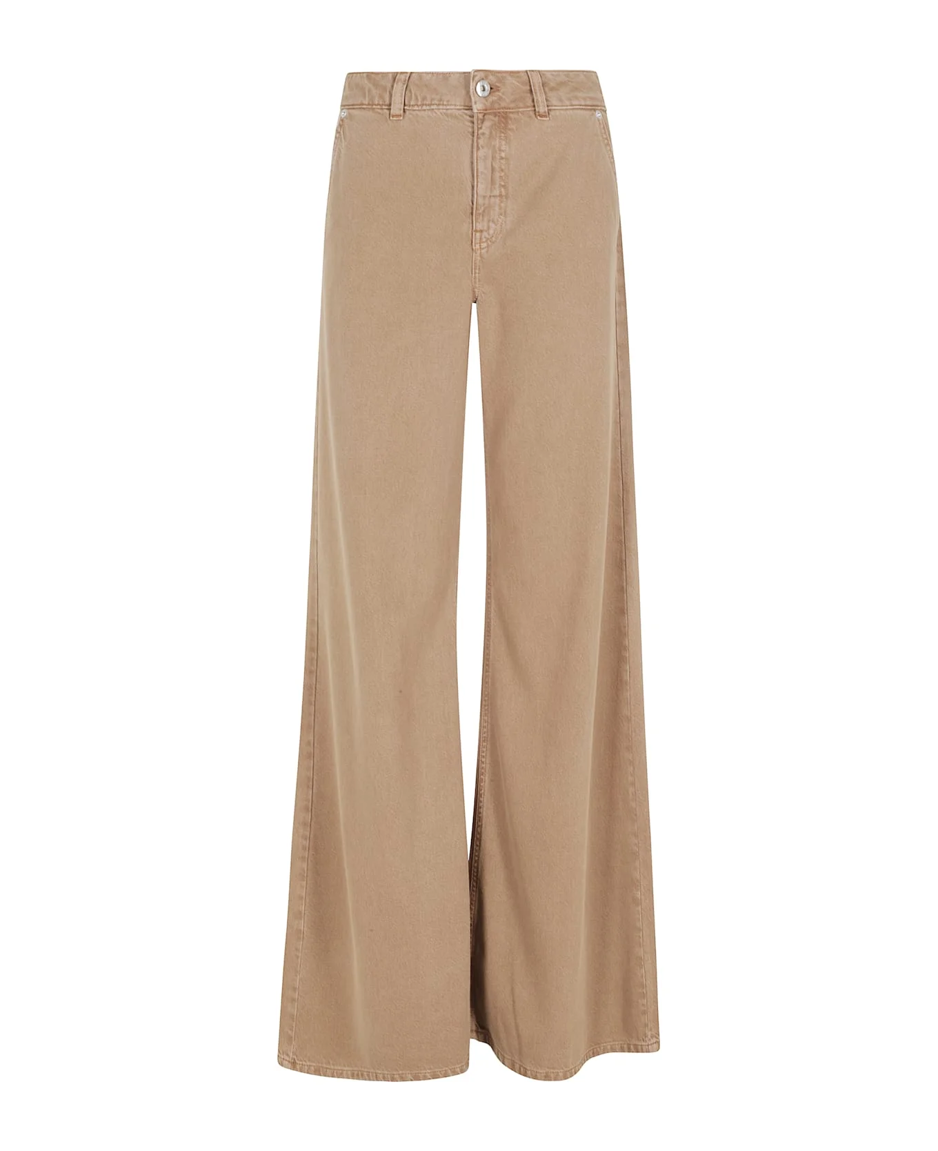 Category: Jeans Article: Jeans flare Brand: Blumarine Color: Beige Pockets: Four-pocket model Details: Belt loops Closure: Front zipper and button SIZE AND FIT Fit: Regular Leg: Wide and flared Made in: Albania Color: Amphora Beige Model number: 2J260A|098N0826