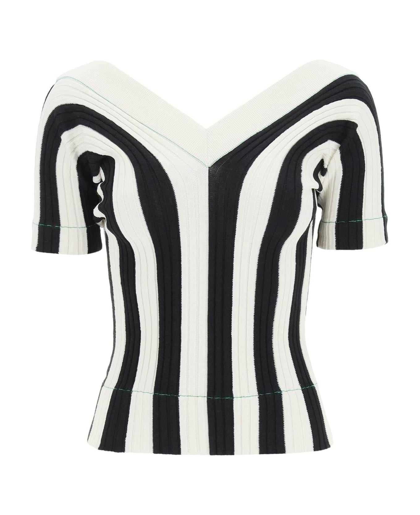 Bottega Veneta short-sleeved top in ribbed linen blend knit with two-tone stripe motif. V-neckline on front and back, contrast stitching detail. The model is 177 cm tall and wears a size XS. Composition: 65% Linen 21% Polyester 14% Polyamide Made in: Italy Color: BLACK Model number: 688928V1N001056