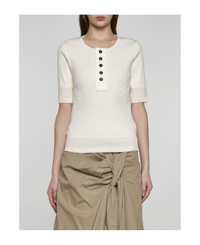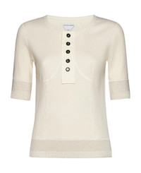 Bottega Veneta's ivory ribbed cotton knit top featuring a crew neck, front partial buttoning and fitted silhouette highlighted by topstitching. Composition: 100% cotton Made in: Italy Color: IVORY Model number: 779195V3Z609028