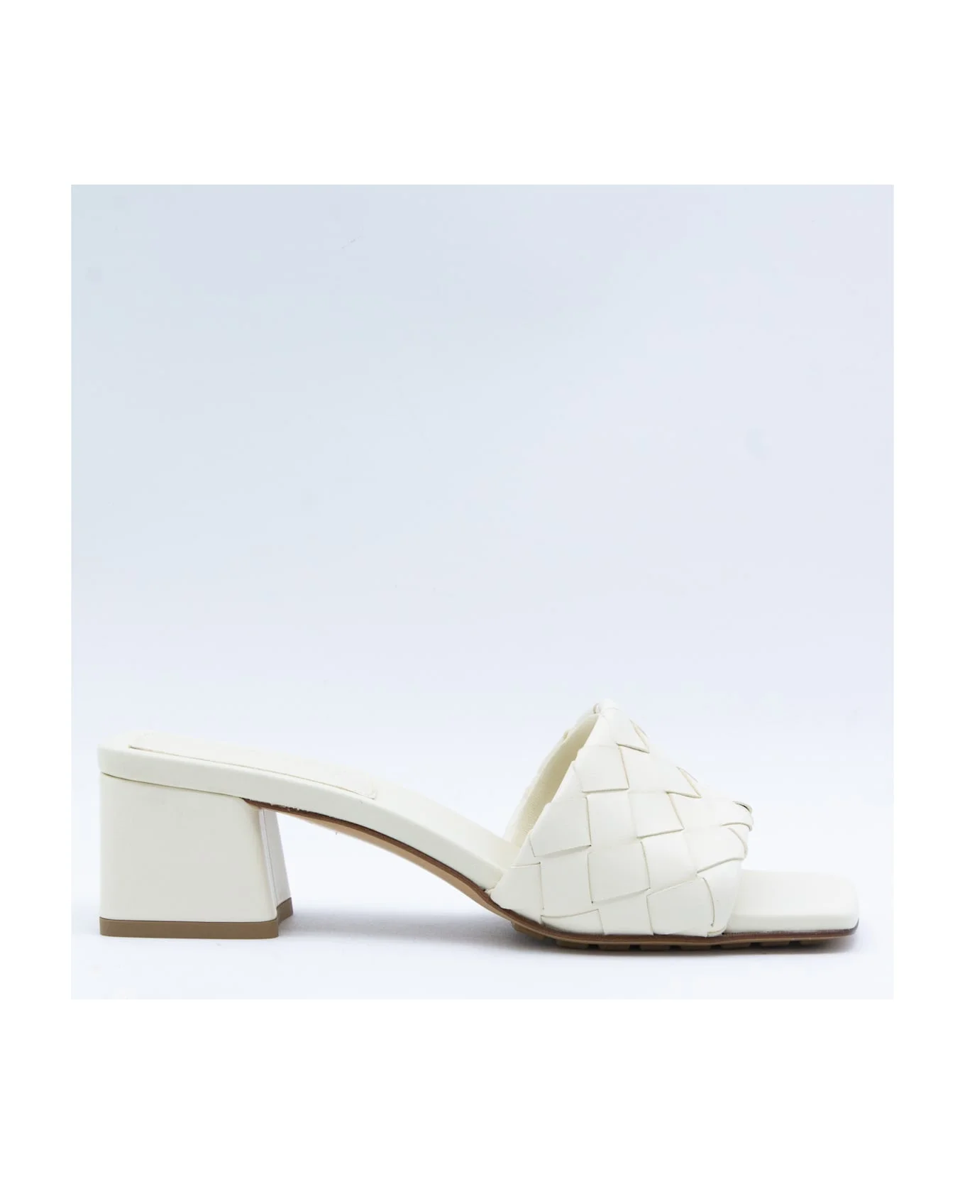 White leather sandals from Bottega Veneta featuring square open toe, slip-on style, Intreccio motif band, open back and block heel. Composition: _cover, 100% Le Sole, 100% Elastodiene Made in: Italy Color: SEA SALT Model number: 838098V2ED09031