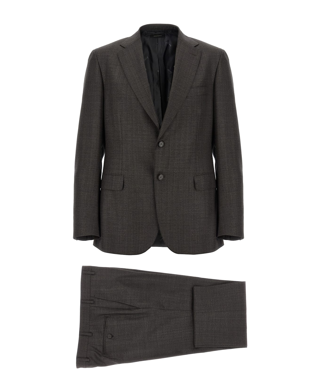 Wool grisaille 'Trevi' dress consisting of a blazer with lightweight construction and relaxed fit, single-breasted style with front button closure, mirror lapels, structured shoulder strap, cupro lining, breast pocket, flap pockets, buttonhole cuffs, back slits and tight flat front pants, stretched pleat, front 'americane pockets', back welt pockets, zip hook and buttons closure on the front. Composition: 100% wool Made in: Italy Color: Brown Size and fit: - true to size fit - DROP 7 Model number: RANP0UODA822500