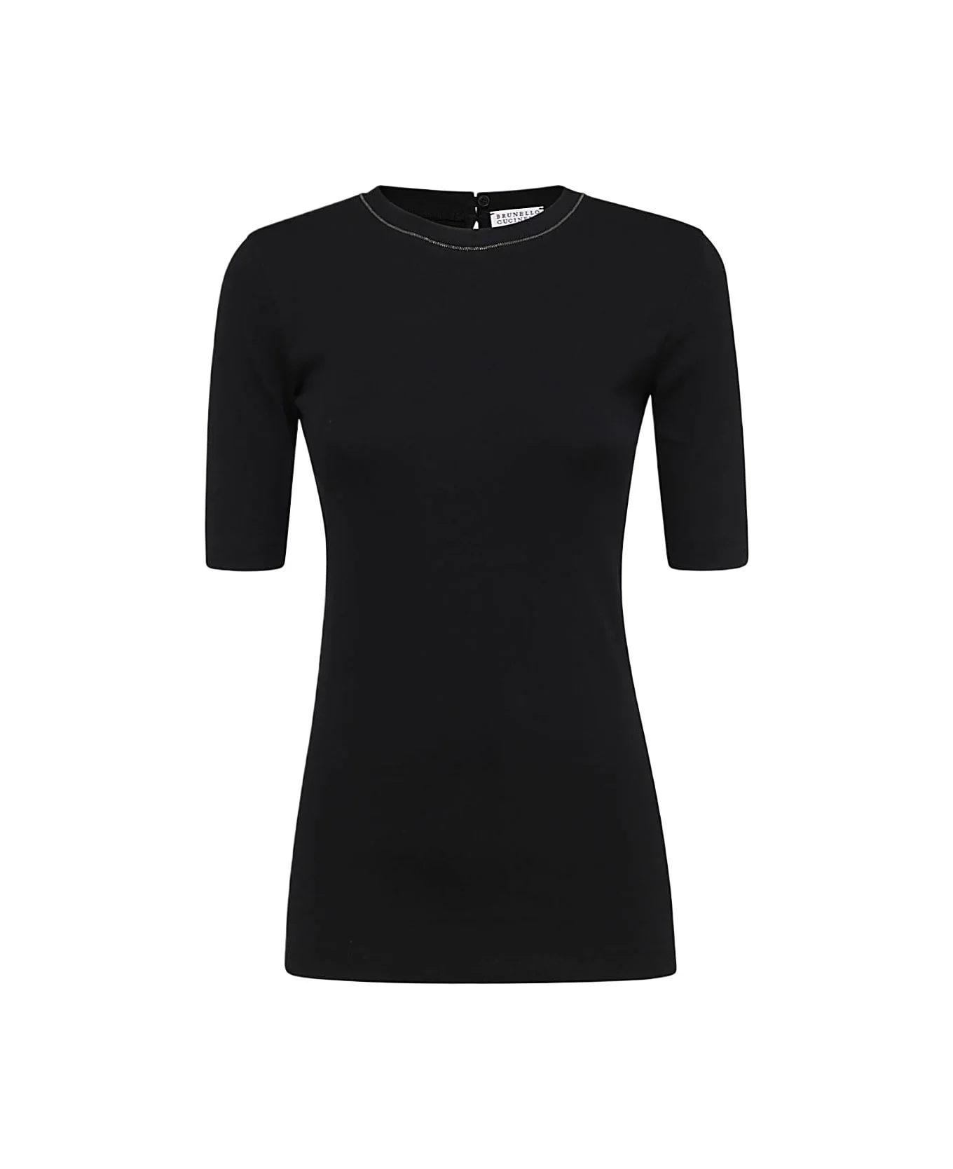 Black cotton t-shirt from Brunello Cucinelli featuring round collar, short sleeves, back fastening and regular vestibility. Composition: _, 96% Cotton, 6% Elastane Made in: Italy Color: Black Model number: M0TC8BJ310C101