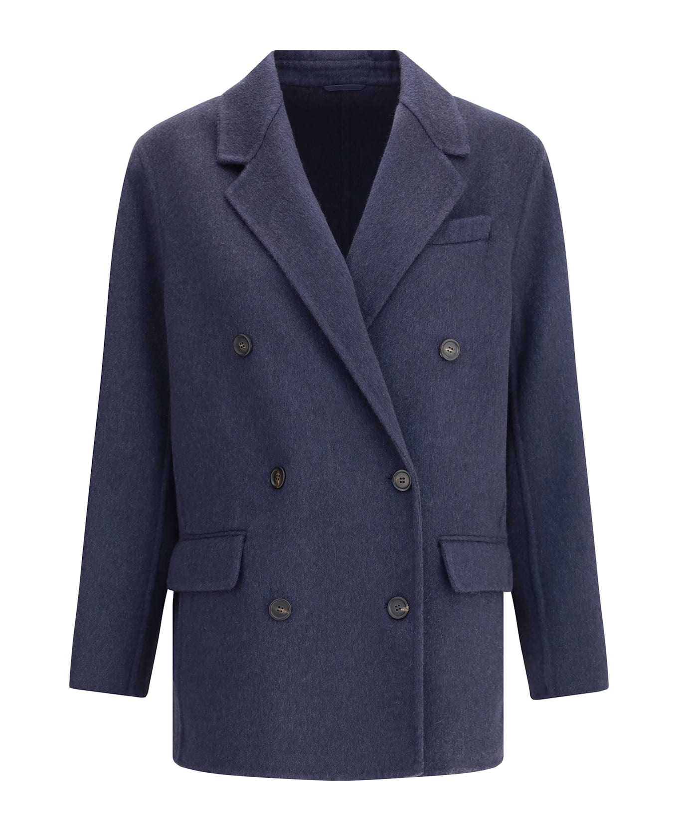 Brunello cucinelli's caban jacket is an elegant and refined garment that blends tradition and modernity. the peaked lapels and double-breasted front closure give it a classic and sophisticated feel, while the two patch pockets on the front with flaps add functionality and style. the back vent gives more freedom of movement, completing the design with a dynamic touch. perfect for a chic and timeless look. Composition: 100% % Kashmir/capra Hircus Made in: Italy Model number: MD5037439PC7186