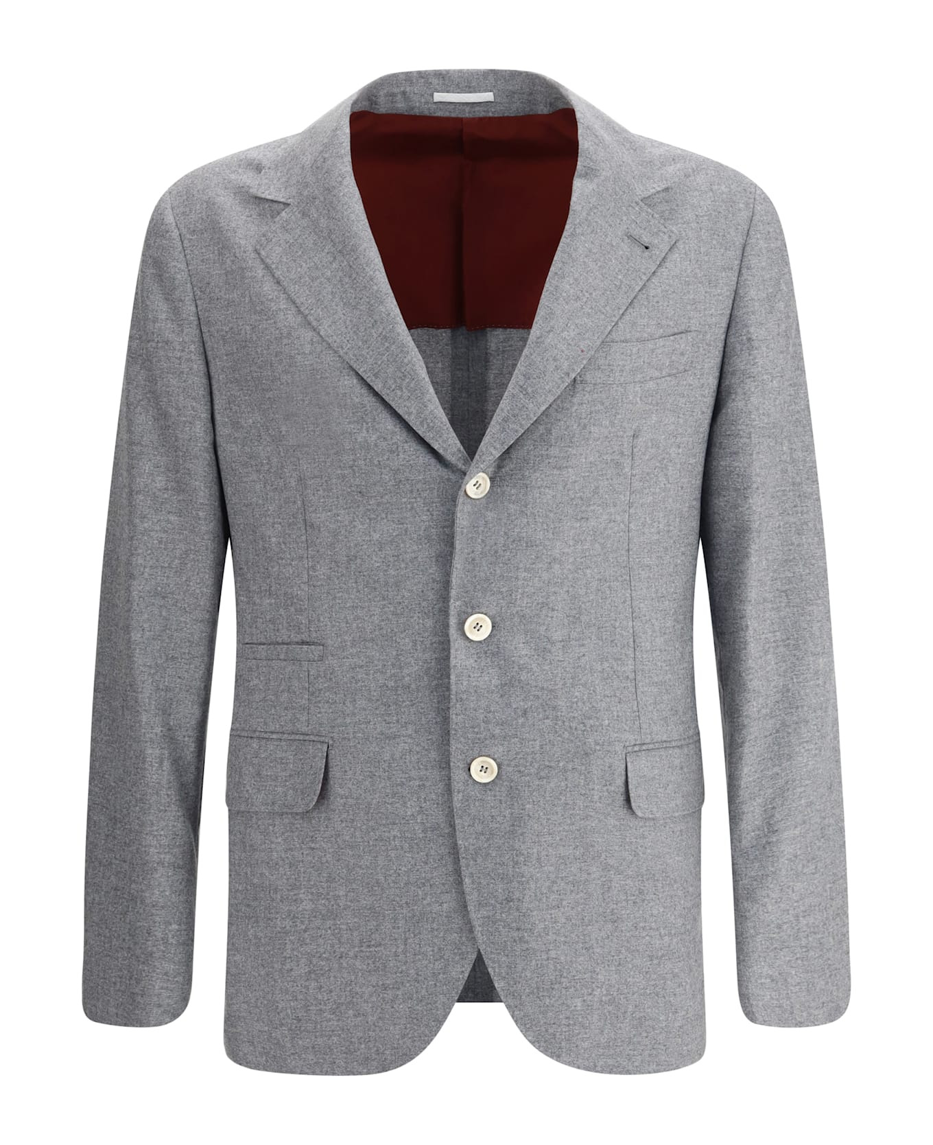 Brunello cucinelli's cashmere and silk flannel blazer expresses timeless sartorial elegance. featuring a three-button ironed horn two-button closure and traditional lapels, it has flap welt pockets, ticket pocket and breast pocket. the cuffs are finished with four horn buttons and opening buttonholes. the half cupro lining reveals two interior buttoned pockets and a pen pocket, while the double back slit ensures comfort and freedom of movement. Composition: 92% % Kashmir/capra Hircus, 8% % Silk Made in: Italy Model number: MR4367BTDC591