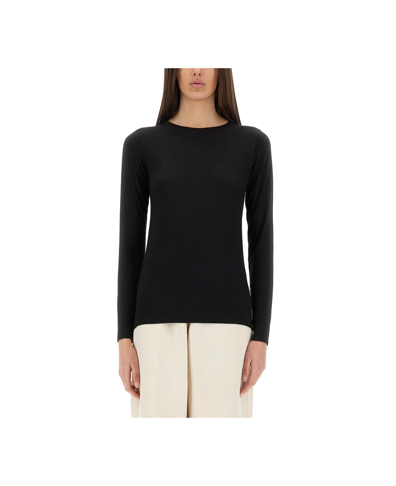 - SLIM FIT - 51% CASHMERE 22% SILK 20% POLYAMIDE 7% METALLIC POLYESTER - MADE IN ITALY - THE MODEL IS 180 CM TALL AND WEARS SIZE S 51% CASHMERE 22% SILK 20% POLYAMIDE 7% METALLIC POLYESTER Made in: Italy Color: BLACK Model number: M41800000C101