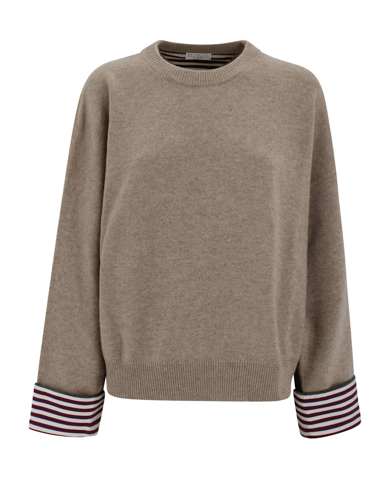 Cashmere jumper with round neck and removable shirt cuffs. Round neck Drop shoulder Wide sleeves Removable shirt cuffs Smooth knit Nickel-free jewellery decoration Composition: 100% Cashmere Made in: Italy Color: Brown Size and fit: - Regular fit Model number: M12709800C077