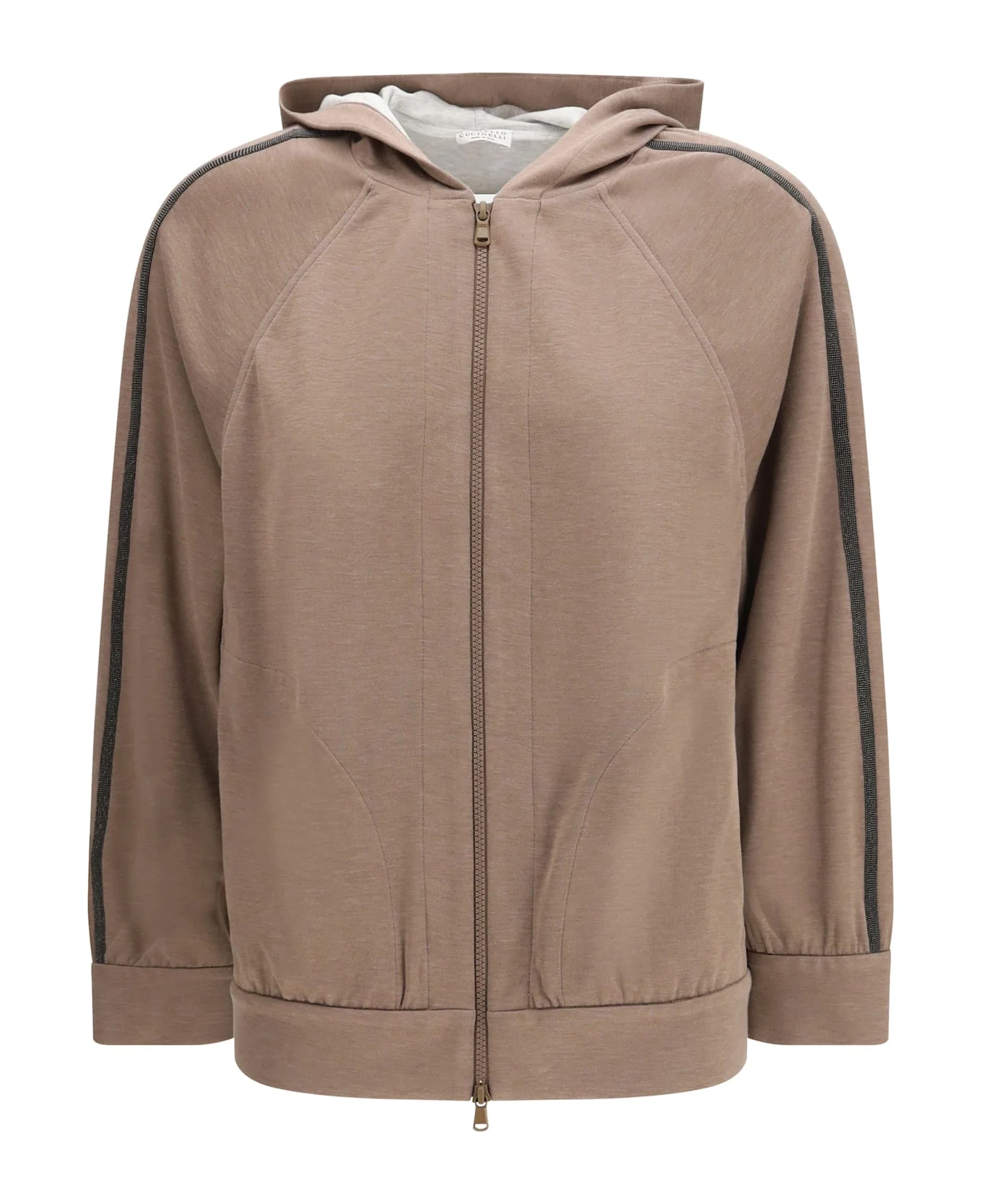 The cotton hooded sweatshirt by brunello cucinelli delivers a refined take on casual wear, enhanced by the brand s iconic sparkling monili details. featuring a front closure with a double-slider zip, it offers both practicality and versatility. tone-on-tone stitching at the cuffs and hem completes the design with a clean, sophisticated finish. Composition: 31% % Silk, 67% % Cotton, 2% % Polyamide Made in: Italy Model number: MD828SM606C9141