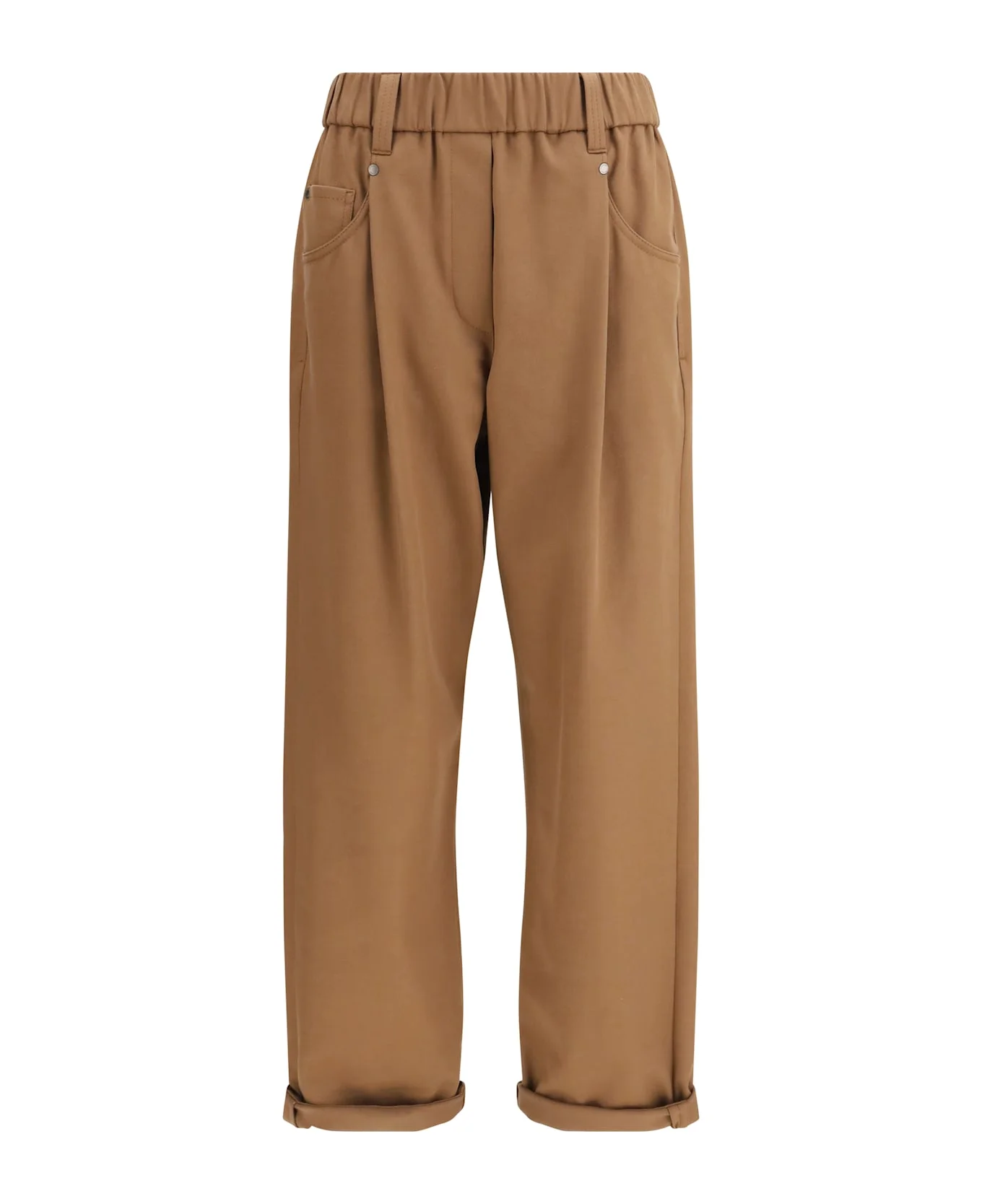 The cotton trousers by brunello cucinelli reinterpret essential tailoring with quiet refinement. crafted in a classic five-pocket design, they feature an elasticated waistband with belt loops that balances structure and comfort. two front pleats add subtle volume, while the high-rise waist and regular fit create a clean, elongated silhouette. finished with a cuffed hem and a monochrome palette, they embody the brand s understated elegance and versatile sophistication. Composition: 97% % Cotton, 3% % Elastane Made in: Italy Model number: MA126P8417C9311