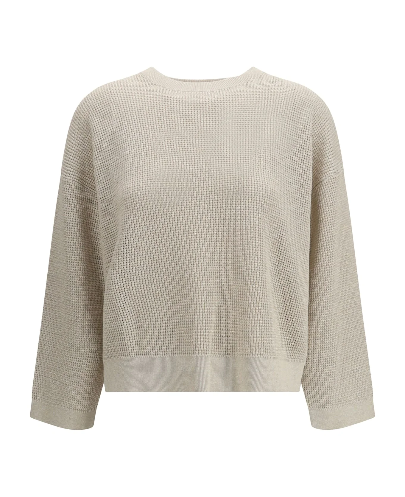 The crewneck sweater by brunello cucinelli elevates everyday knitwear through the brand s signature refinement. crafted from soft cotton, it features subtle shimmering accents woven directly into the yarn an intrinsic brightness rather than added embellishment creating a naturally luminous and sophisticated texture. long, clean-cut sleeves and ribbed trims shape a streamlined silhouette, offering understated elegance with timeless appeal. Composition: 79% % Cotton, 16% % Viscose, 5% % Polyester Made in: Italy Model number: MST263300CY948