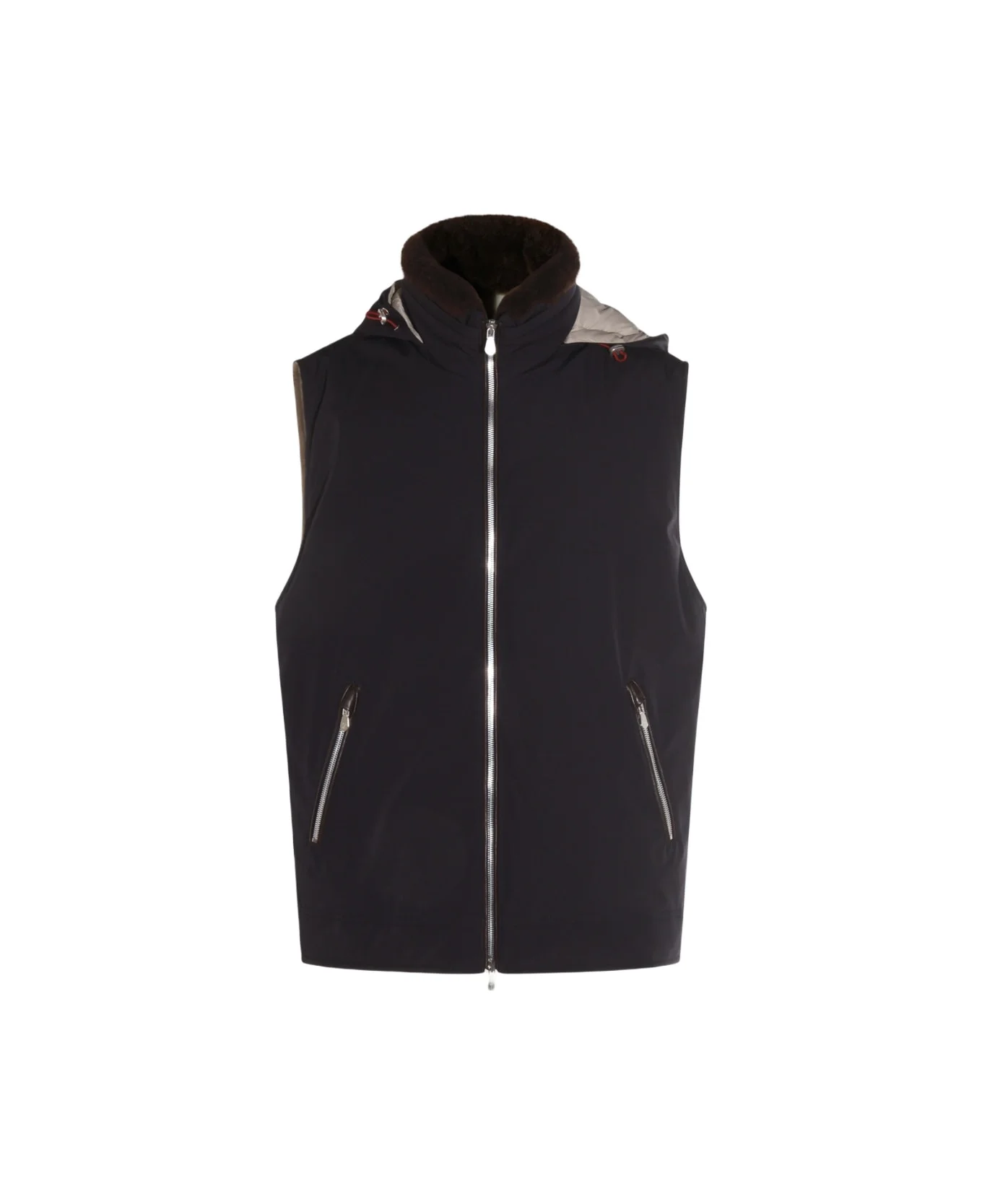 Dark blue down jacket from Brunello Cucinelli featuring fur collar, sleeveless, hood, zip fastening, zipped pockets and regular vestibility. Composition: _, 88% Polyamide, 12% Elastane Made in: Italy Model number: MV4061656CQZ29