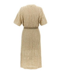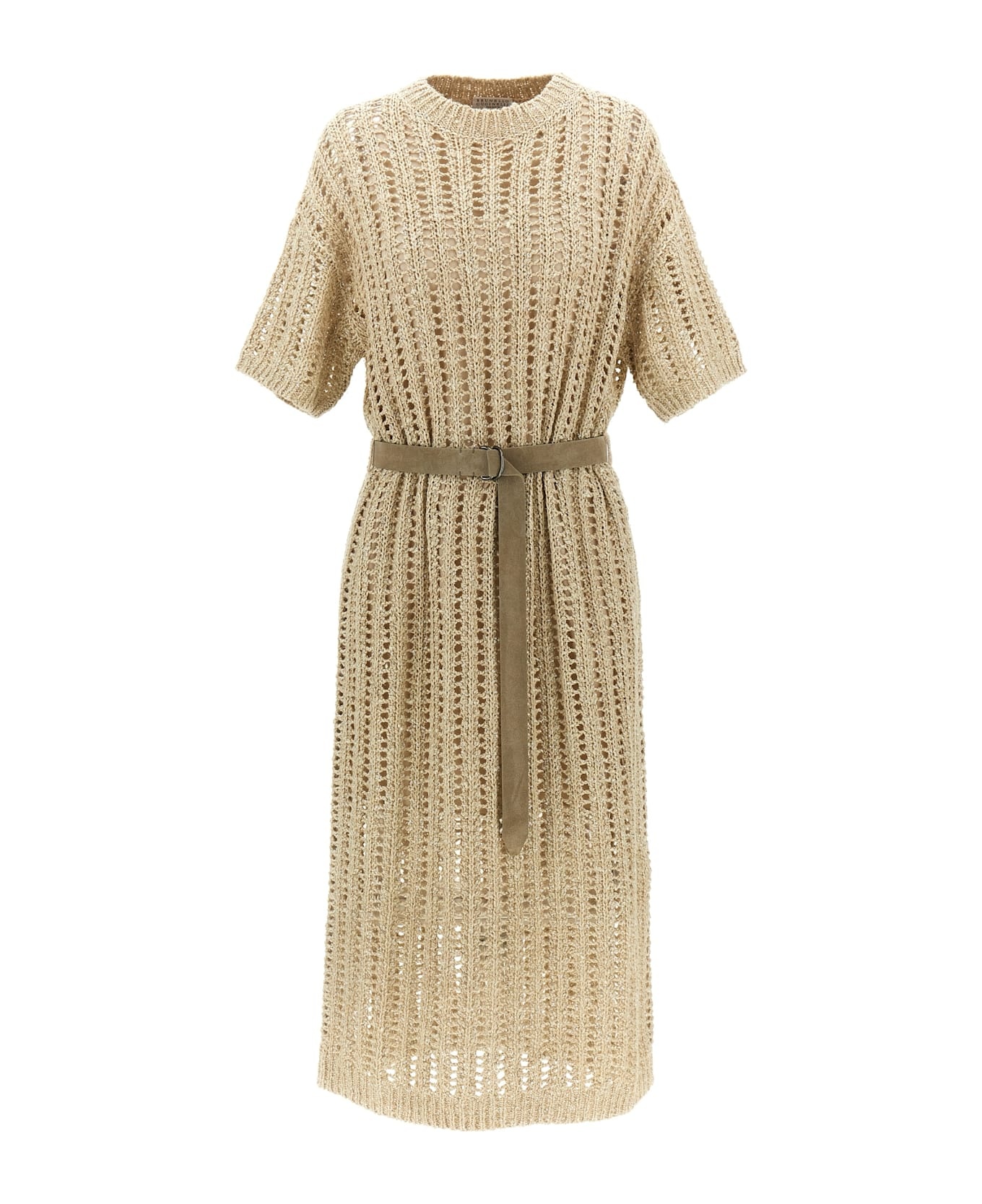 Dazzling silk and linen openwork rib knit dress with suede belt