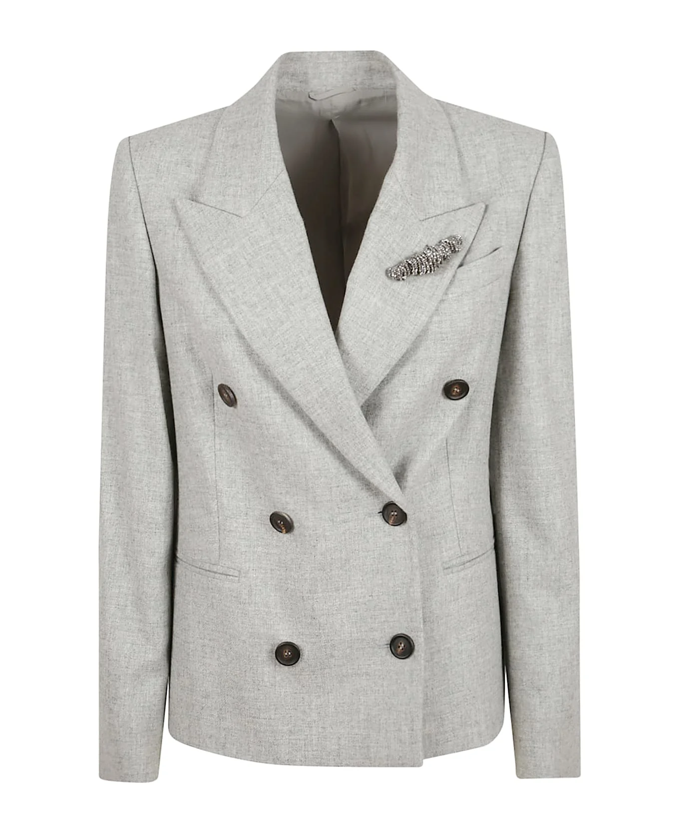 Double-breasted six-button closure Peak lapel; nickel-free monili brooch embroidery on the lapel Long sleeves, structured shoulders, four-button cuffs Welt pockets at the waist, breast pocket Lined Color: gray Composition: 95% Virgin Wool, 5% Cashmere Made in: Italy Color: Light Grey Model number: MB1627410C030