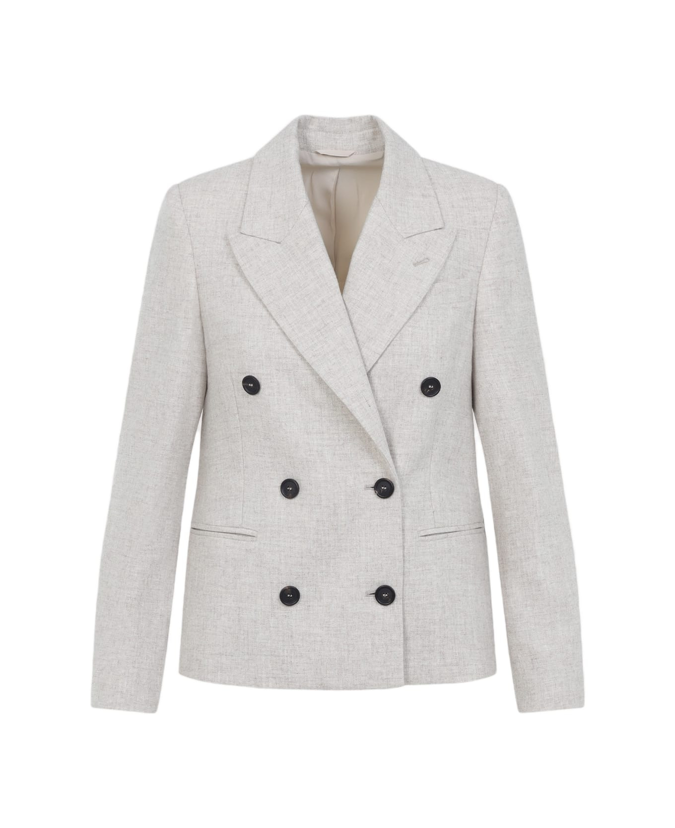 Brunello Cucinelli Double Breasted Beige Virgin Wool Jacket. Crafted from beige virgin wool and cashmere, double breasted construction, peak lapels, front button fastening, welt pocket on the breast and two front pockets, buttoned cuffs, straight hem, lined. Made in: Italy Color: Beige Model number: MB1627414C012