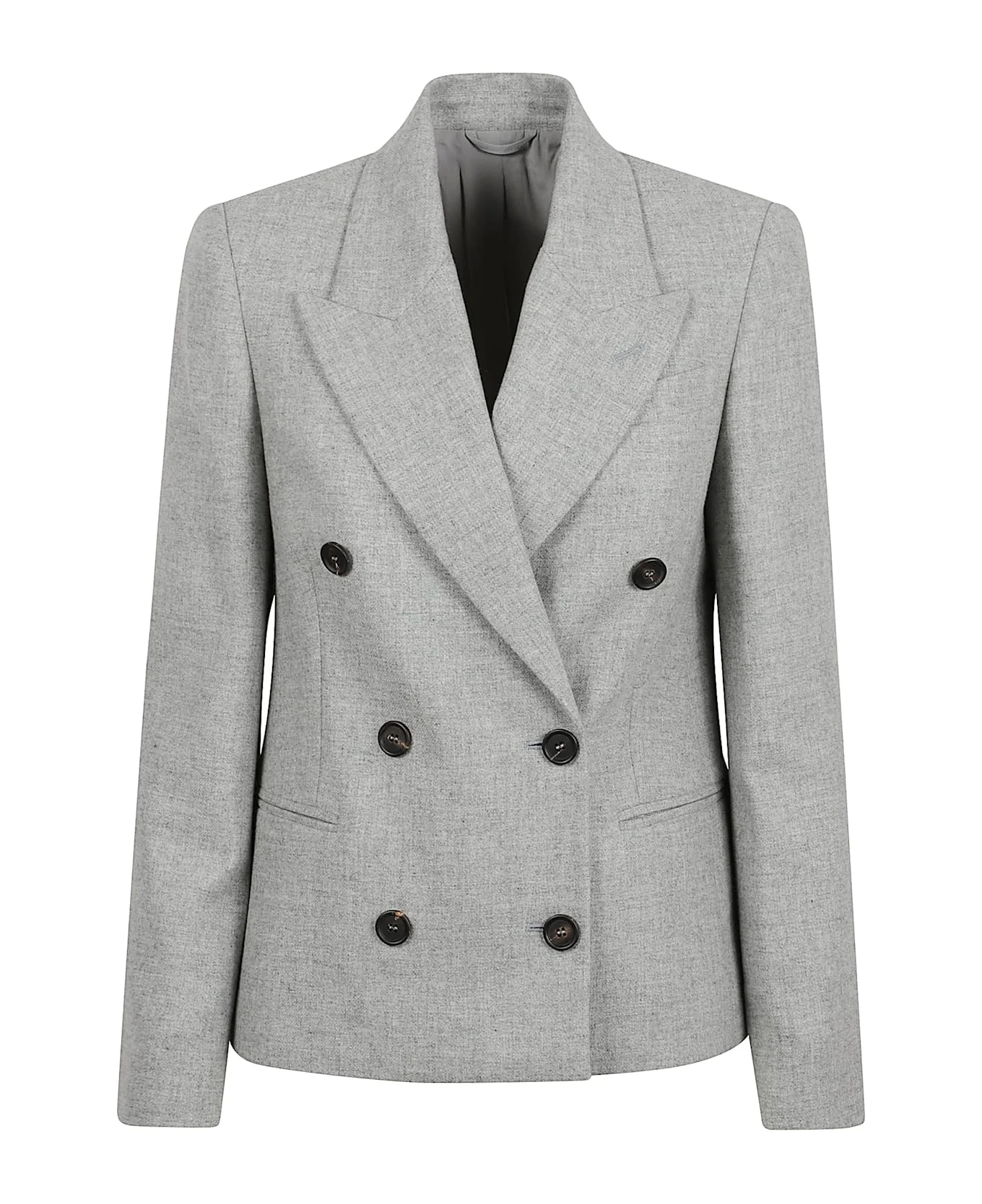 Brunello Cucinelli double-breasted jacket in light grey virgin wool and cashmere, featuring a lapel collar, front button fastening, chest welt pocket, front welt pockets and buttoned cuffs. Composition: 95% Virgin Wool, 5% Cashmere Made in: Italy Color: Light Grey Model number: MB1627414C030