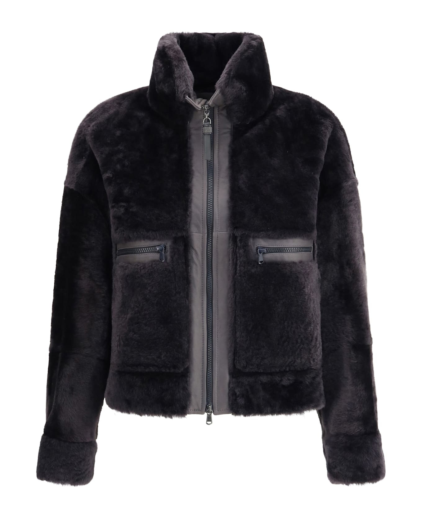 Shearling outerwear jacket with shiny zipper pull