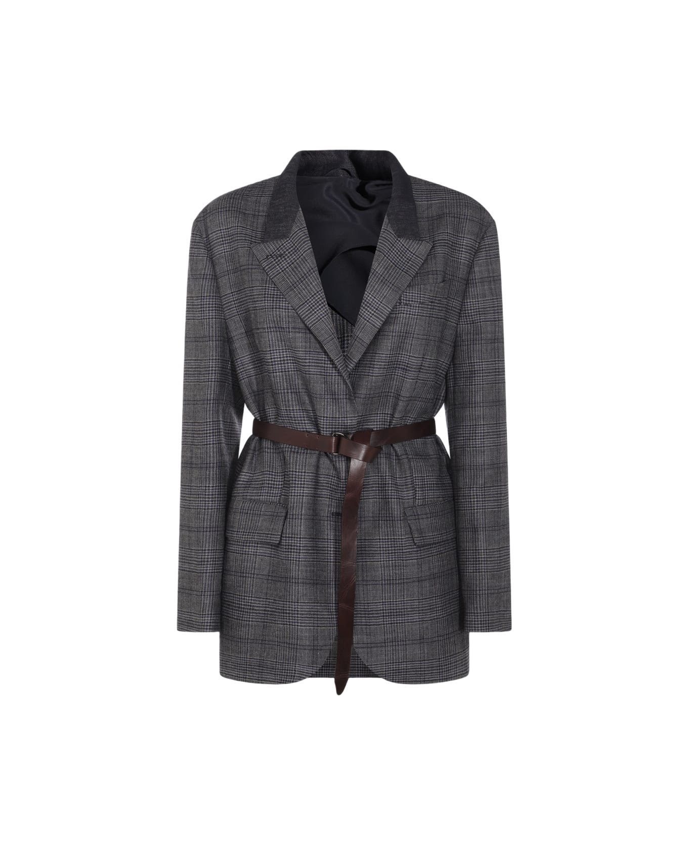 Virgin wool Prince of Wales blazer with leather belt and monili