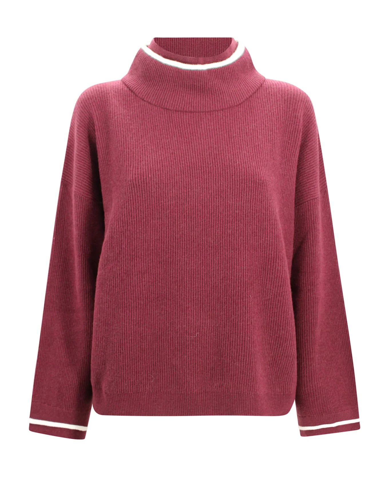 Refinement and comfort with this turtleneck sweater made of fine wool and cashmere, featuring a soft fit and an essential design, burgundy color with white trim on the collar and cuffs. Wool, cashmere and silk Structured high neck Collar and sleeves with contrasting finishes Straight cut Composition: 60% Lana Vergine, 30% Cashmere, 10% Seta Made in: Italy Color: Pink Size and fit: - soft fit Model number: M16222704CST76