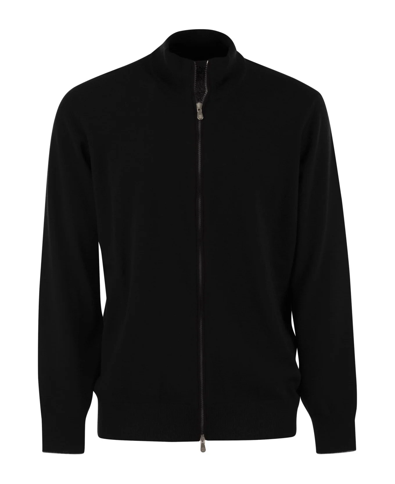 An essential item in a man's wardrobe, the pure cashmere cardigan is ideal to enrich every outfit with a casual yet elegant style. The contrasting inserts on the cuff profiles add a sophisticated touch to the classic volumes of the garment. The cardigan offers a regular fit. - Zip and double-slider closure - High collar in ribbed knit - Rib knit cuffs and hem - Shaved knit DESIGNER ID: M2200106 CH101 Composition: 100% Cashmere Made in: Italy Model number: M2200106CH101