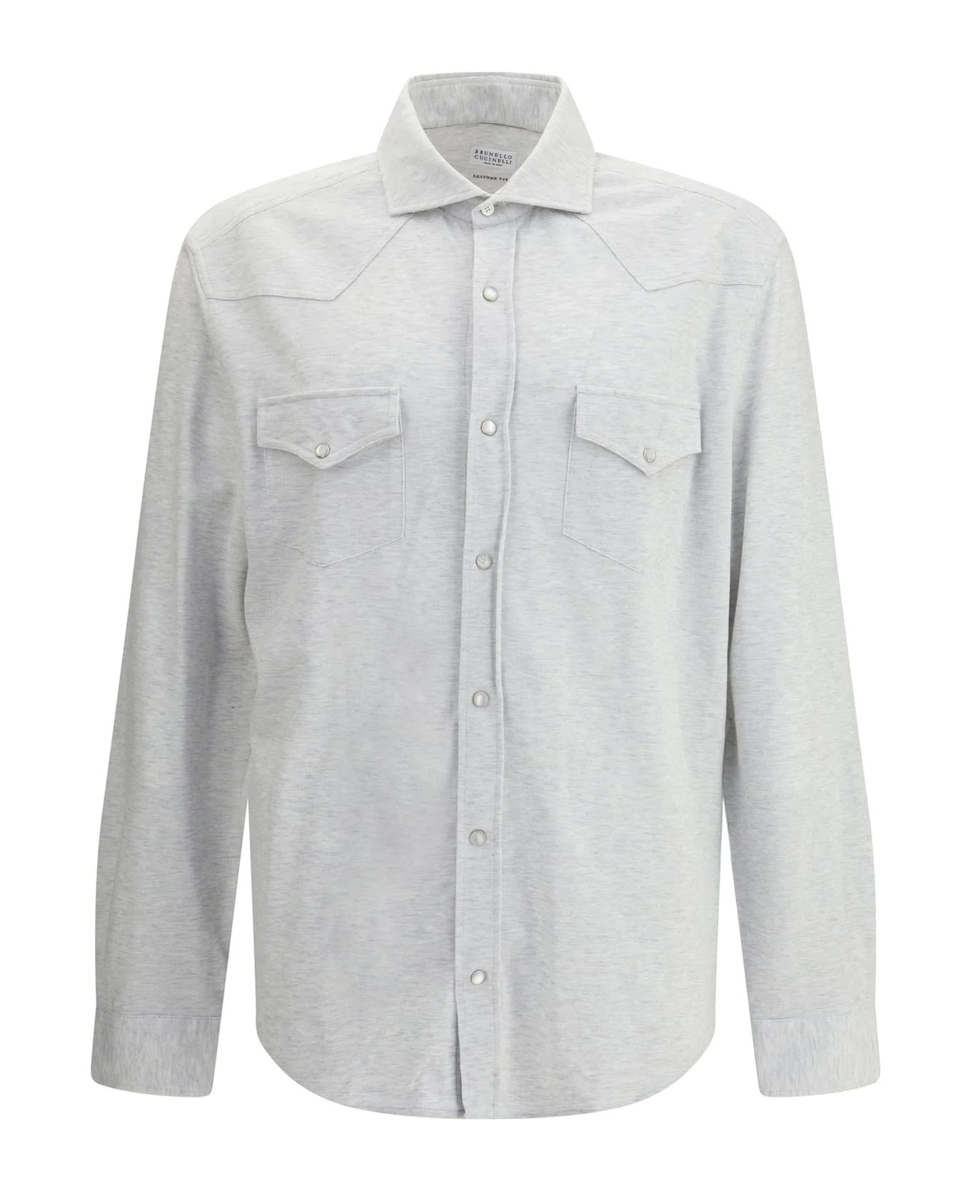The knit shirt by brunello cucinelli is a refined piece that combines the style of a classic shirt with the comfort of knitwear. crafted in an elegant grey melange, it features a snap button closure, a classic collar, and two front patch pockets with flaps. a perfect balance of casual elegance and excellent craftsmanship. Composition: 100% % Cotton Made in: Italy Model number: ME8546666C3657