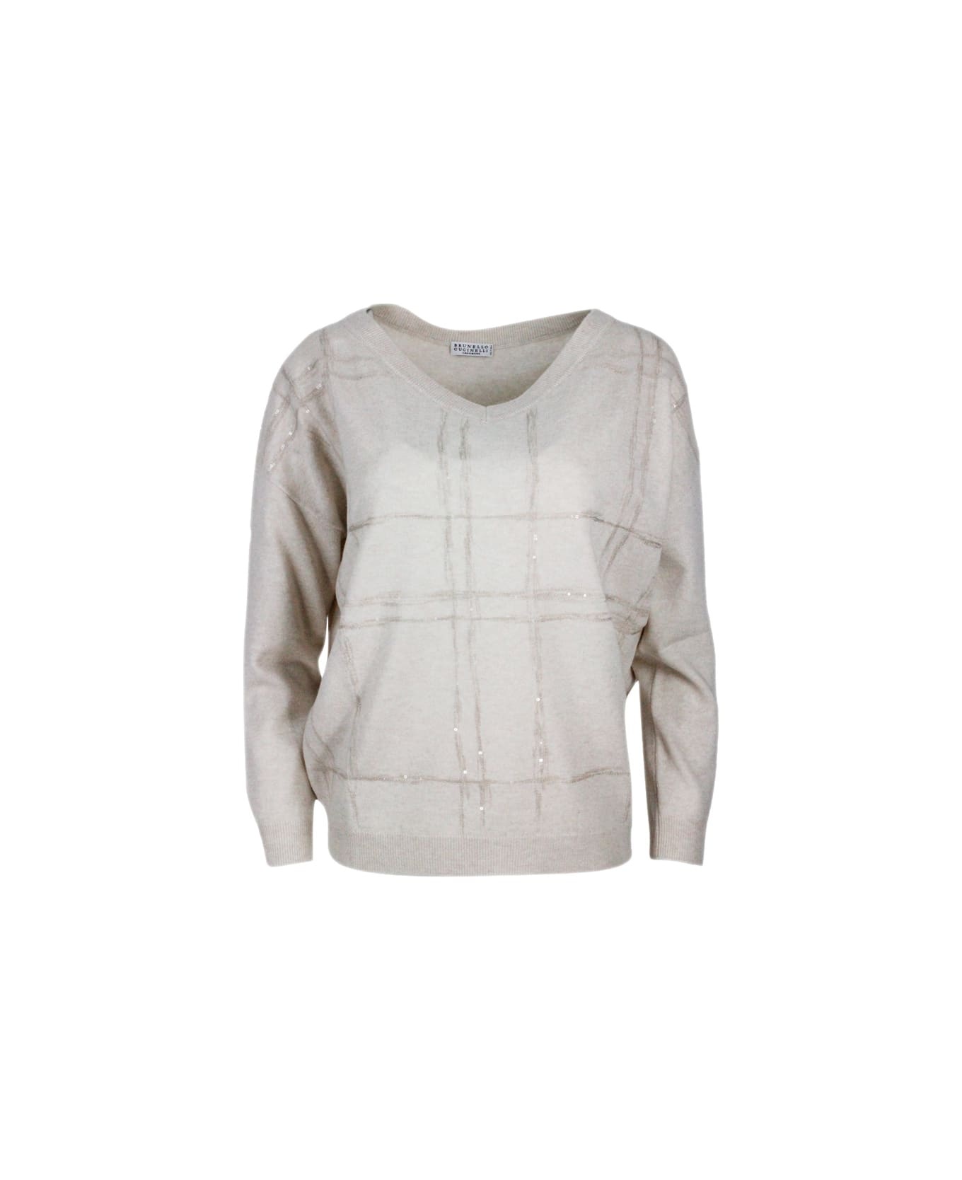 Lightweight V-neck Long-sleeved Oversized Sweater With Window Motif Embellished With Micro-sequins I