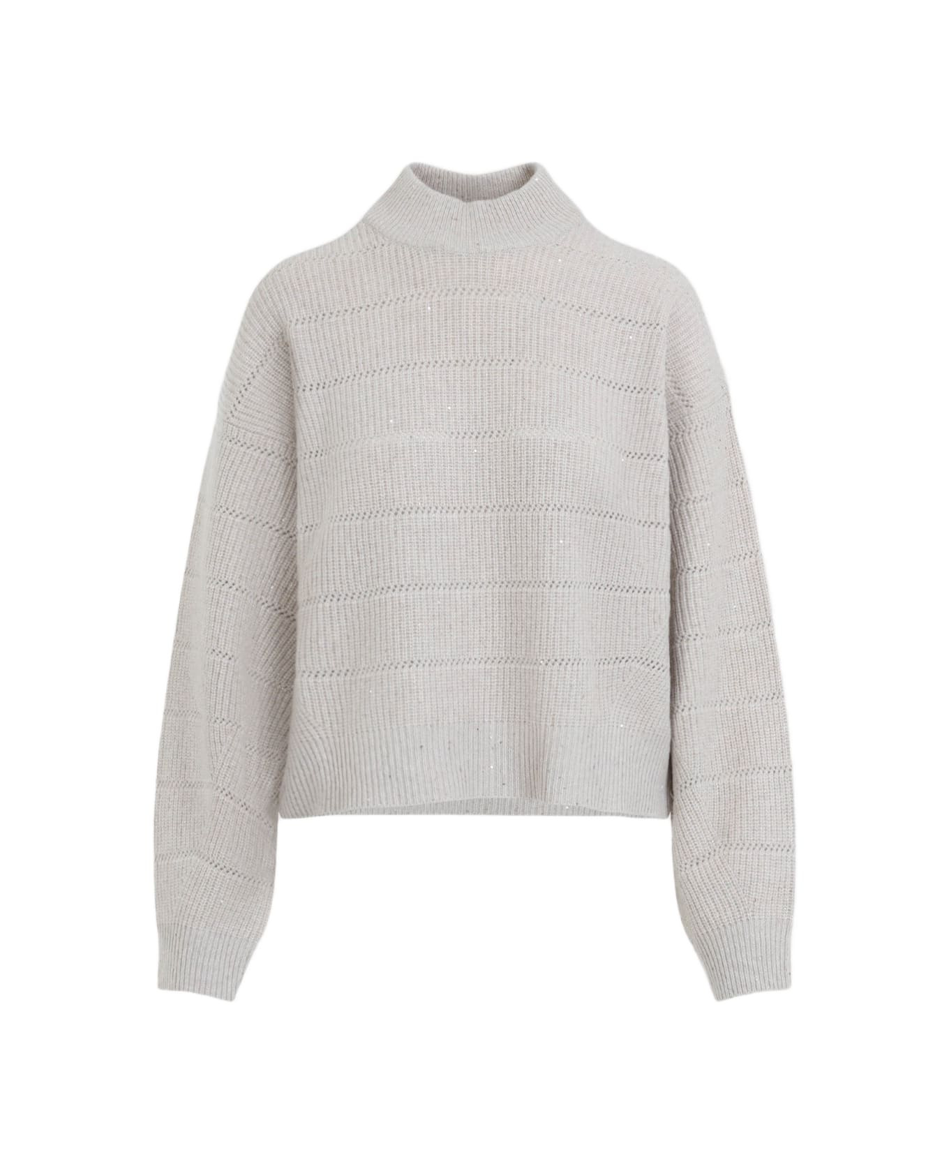 Brunello Cucinelli Beige Cashmere Mock Neck Lana Cashmire Stripe Pullover. Crafted in cashmere, wool, polyester and polyamide blend. Mock neck, dropped shoulders, long sleeves, ribbed cuffs and hem, straight hem, relaxed fit. Knitted design and perforated details. Made in: Italy Color: Beige Model number: MBM738204PC505