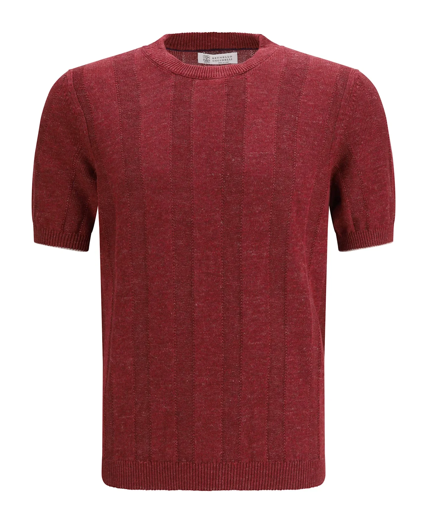 The short-sleeve knitted top by brunello cucinelli conveys understated elegance through a refined and lightweight construction. designed with a crew neckline, it features a ribbed texture that enhances the surface of the piece. the knitted design crafted from a linen-blend yarn offers a natural balance between comfort and sophistication, resulting in a versatile and contemporary aesthetic. Composition: 77% % Linen, 23% % Cotton Made in: Italy Model number: M2L707800CHG67