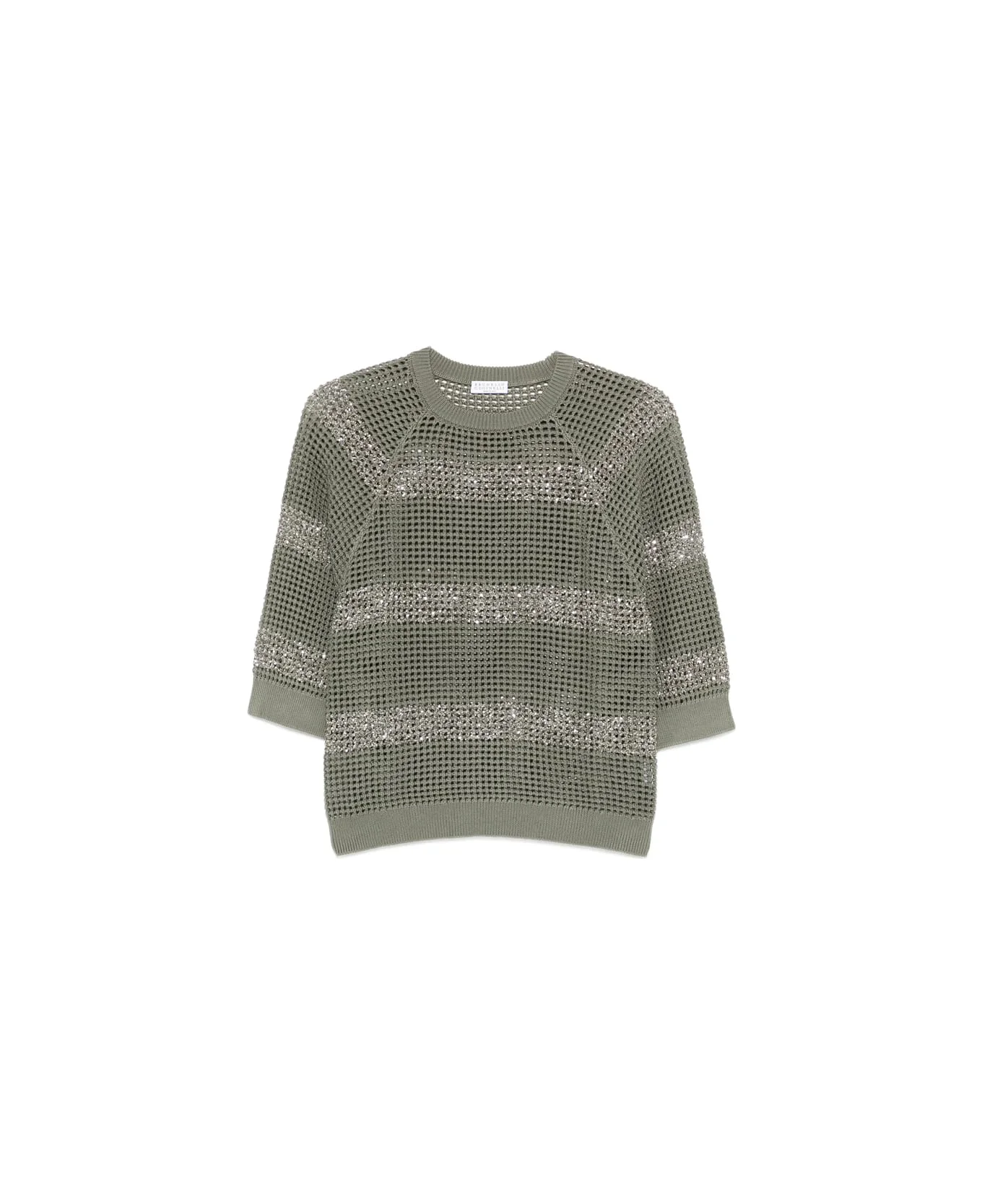green open knit sequin embellishment round neck three-quarter sleeves ribbed cuffs Made in: Italy Color: GREEN/SILVER Model number: M58772800COC75