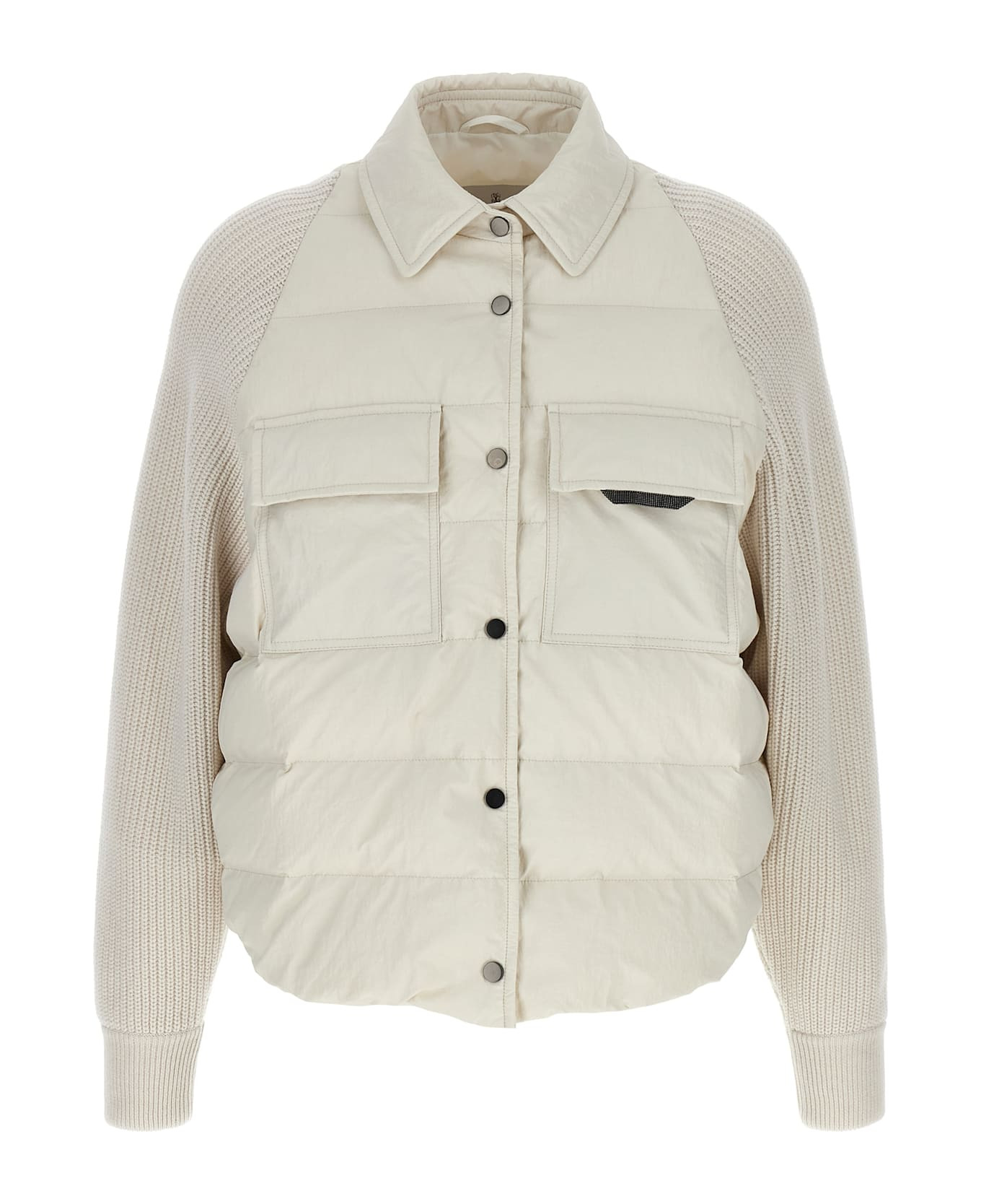 Water-resistant techno cotton and virgin wool, cashmere and silk knit down jacket with shiny flap de