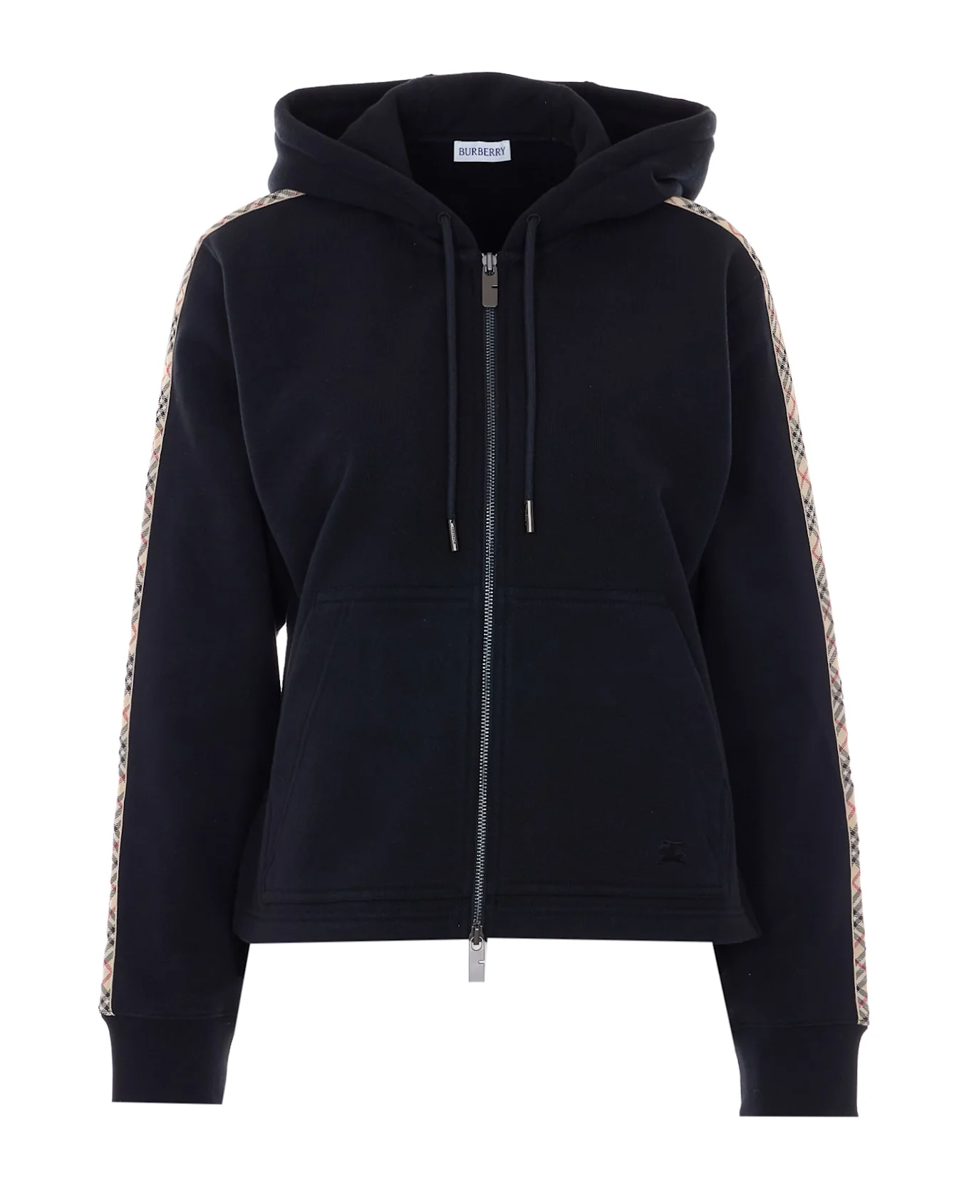 Burberry black Harper zip hoodie, zip closure, coulisse detail, lateral pockets, embroidered logo on the front, check and logo Composition: 100% Cotton Made in: Portugal Color: Black Size and fit: - US SIZE Model number: 8121158A1189