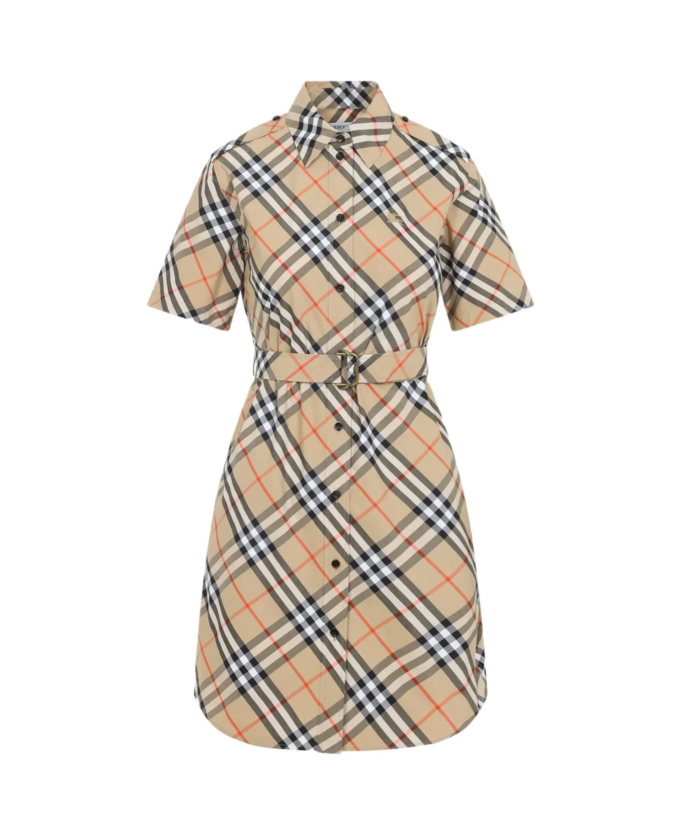 Burberry Check Beige Cotton Midi Dress. Crafted from signature beige check cotton poplin, pointed collar, front button fastening, embroidered logo on the chest, short sleeves, tonal belt with buckle, side pockets, back yoke, curved hem. Made in: Thailand Color: Sand Ip Check Model number: 8111701B9368