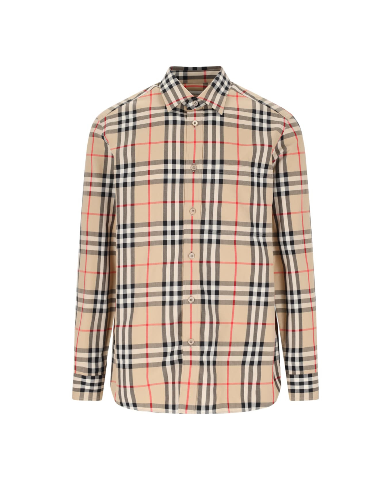 Burberry check shirt in beige cotton with black and red details, classic collar, button closure, button cuffs, curved hem. Composition: 100% Cotton Made in: Tunisia Color: Archive Beige Ip Chk Size and fit: - vestibilita regolare Model number: 8070577A7028