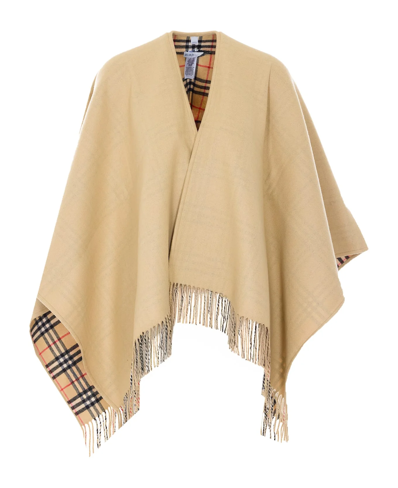 Burberry beige check cape, check motif, fringes details Composition: 100% Wool Made in: United Kingdom Color: Beige Size and fit: - UNI SIZE Model number: 8122805C1309