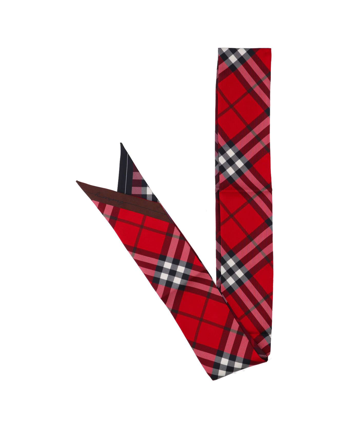 Burberry 'Check' scarf in red silk with black and twin details, logo label, brown hem. Composition: 100% Silk Made in: Italy Color: Red Size and fit: - A 178 X L 8 cm Model number: 8110367B7308