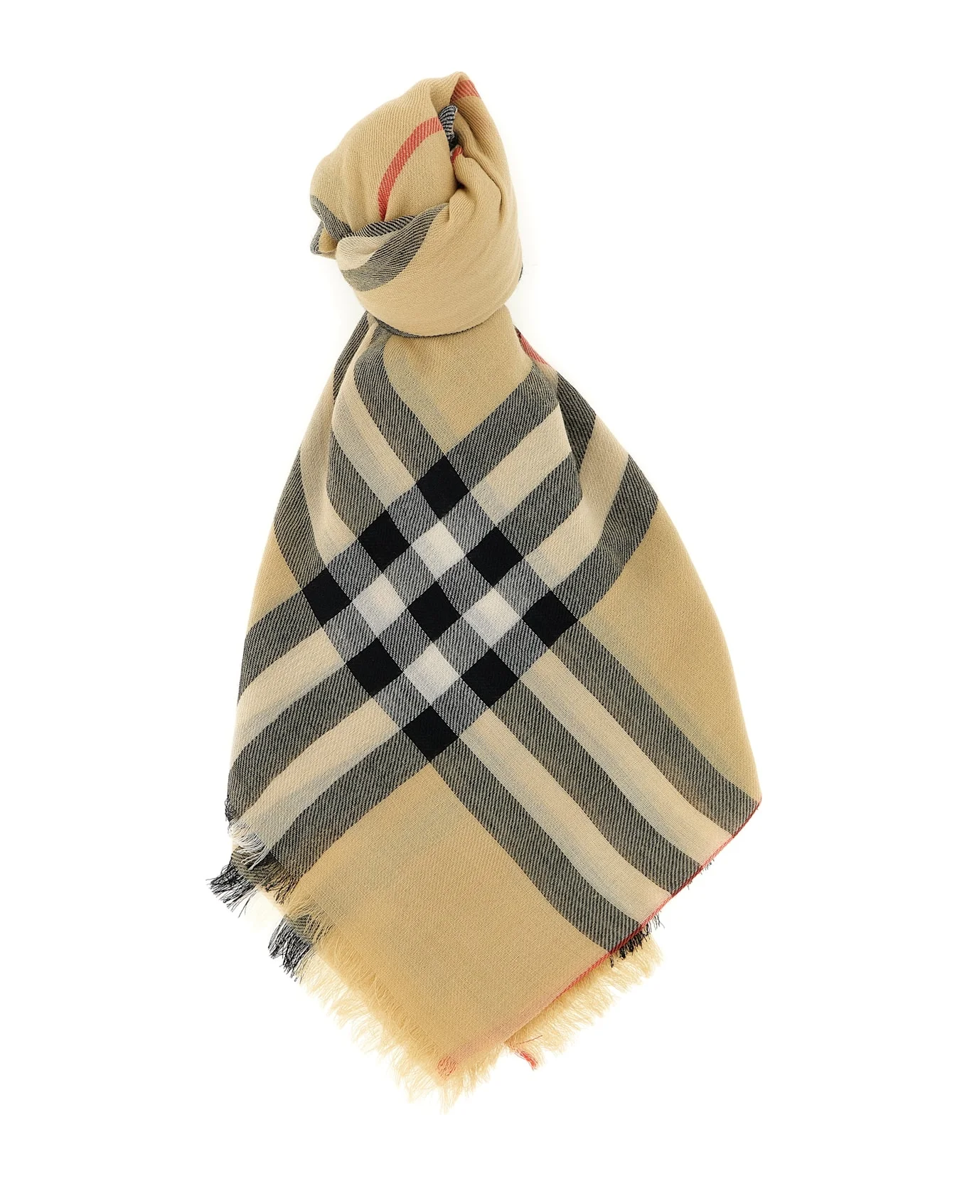 Burberry Check light wool muslin scarf, fringed edges. Composition: 100% wool Made in: Italy Color: Beige Model number: 8122127SAND