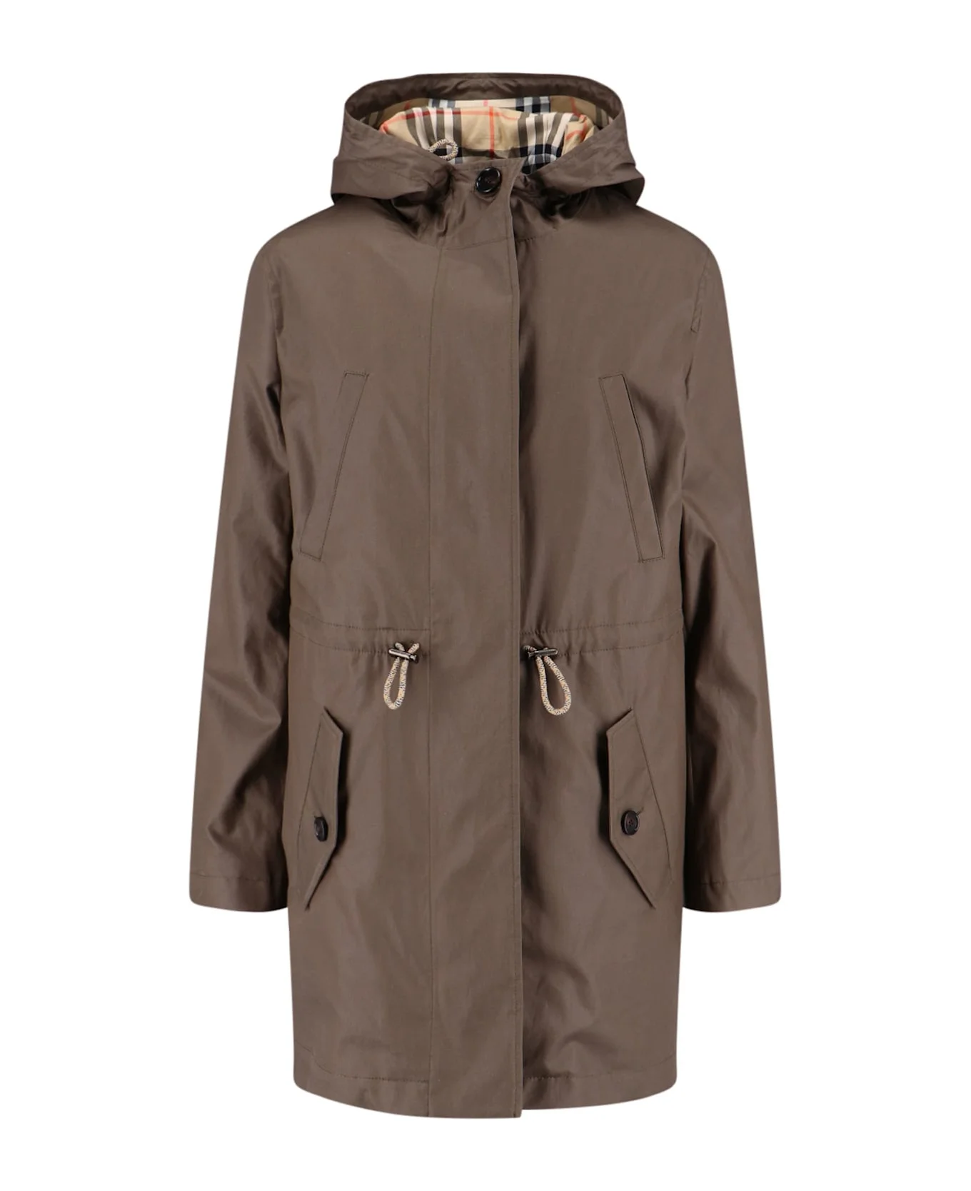 Burberry classic green cotton parka with drawstring hood, button and zip closure, two welt pockets on the chest, drawstring at the waist, two side flap pockets on the hem, straight hem. Composition: 100% Cotton Made in: United Kingdom Color: Green Size and fit: - Vestibilita regolare Model number: 8116104A1336